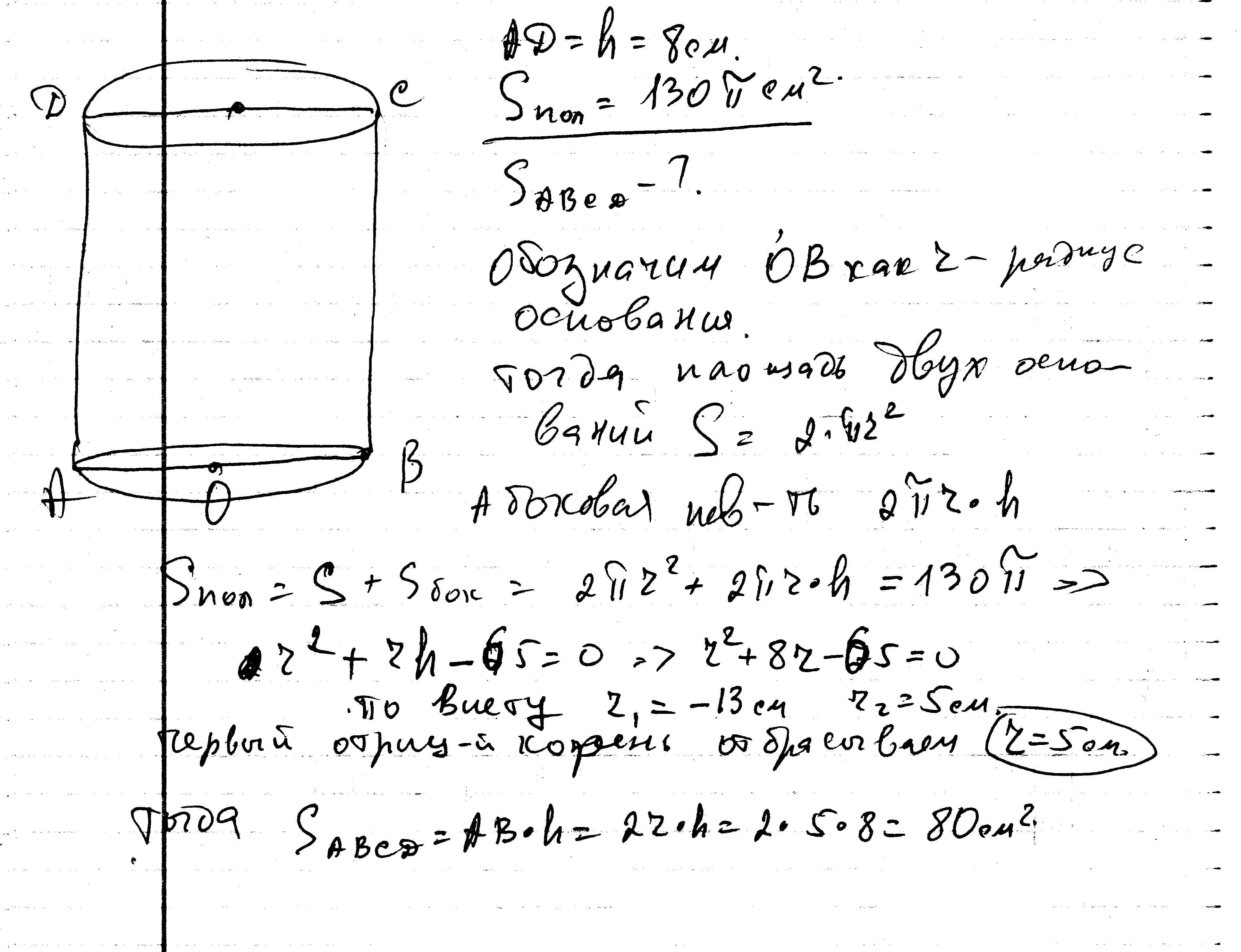 Высота цилиндра равна 8 см,площадь его полной поверхности равна 130п см².Найдите площадь осевого сечения данного цилиндра.