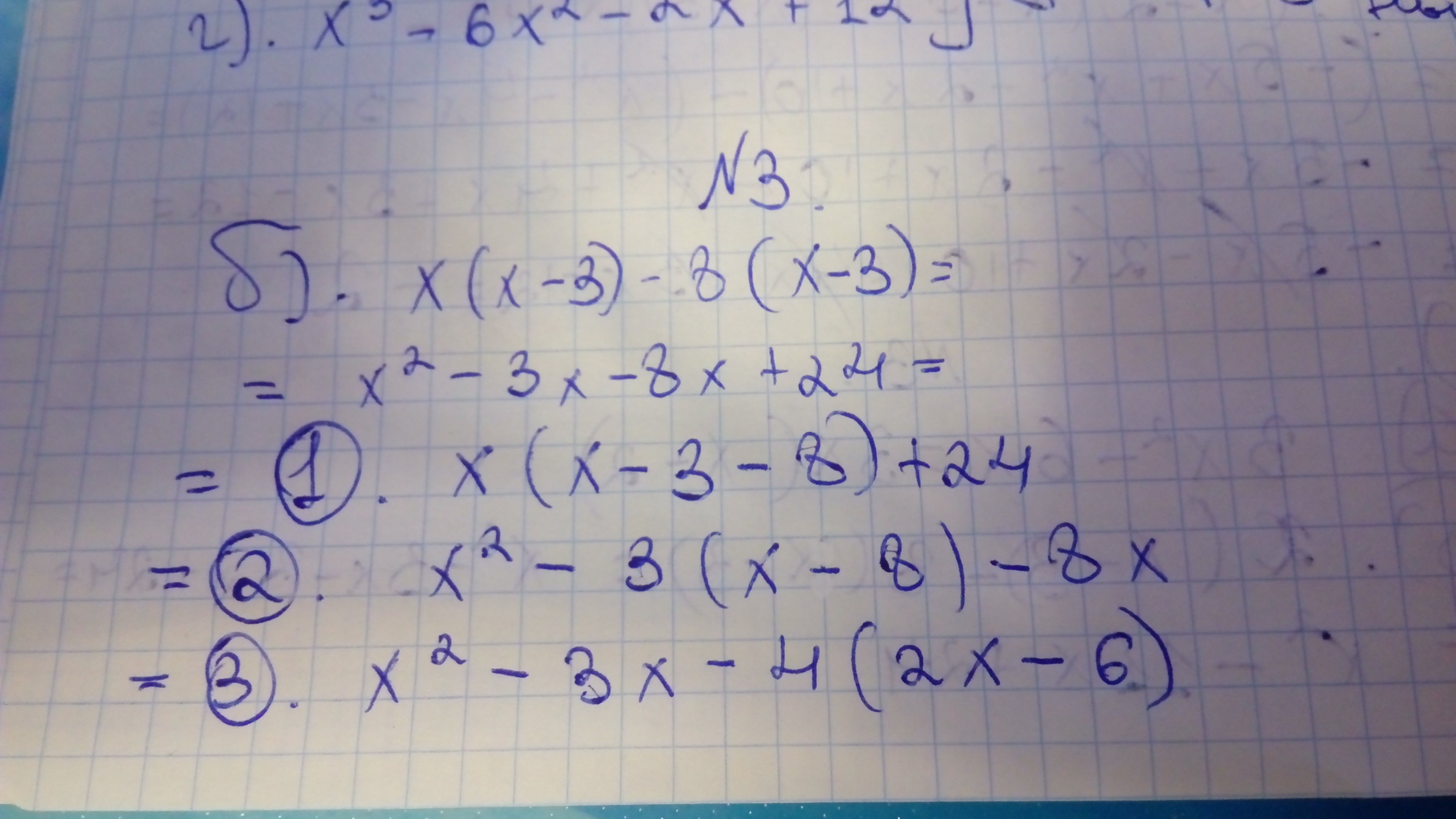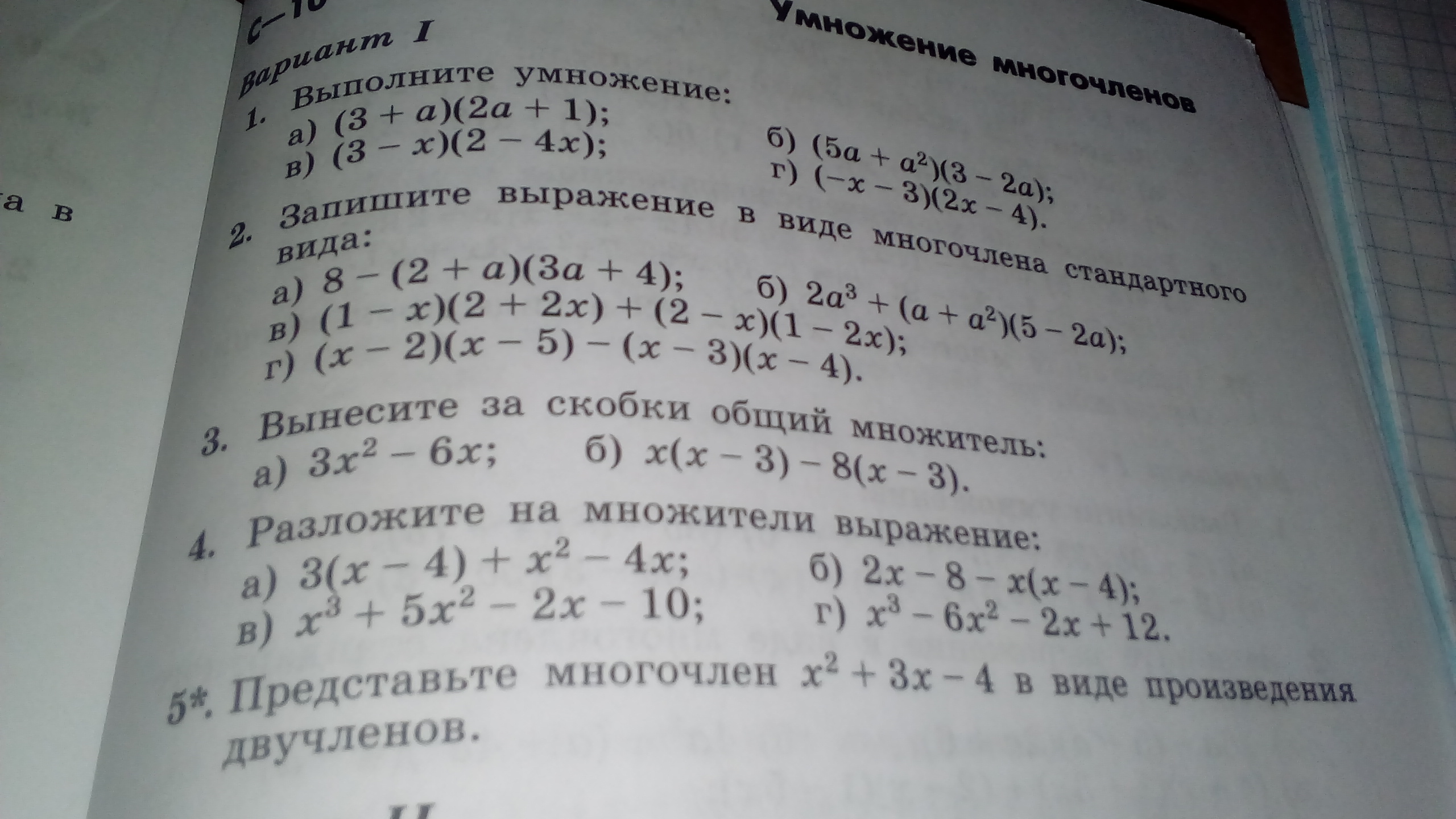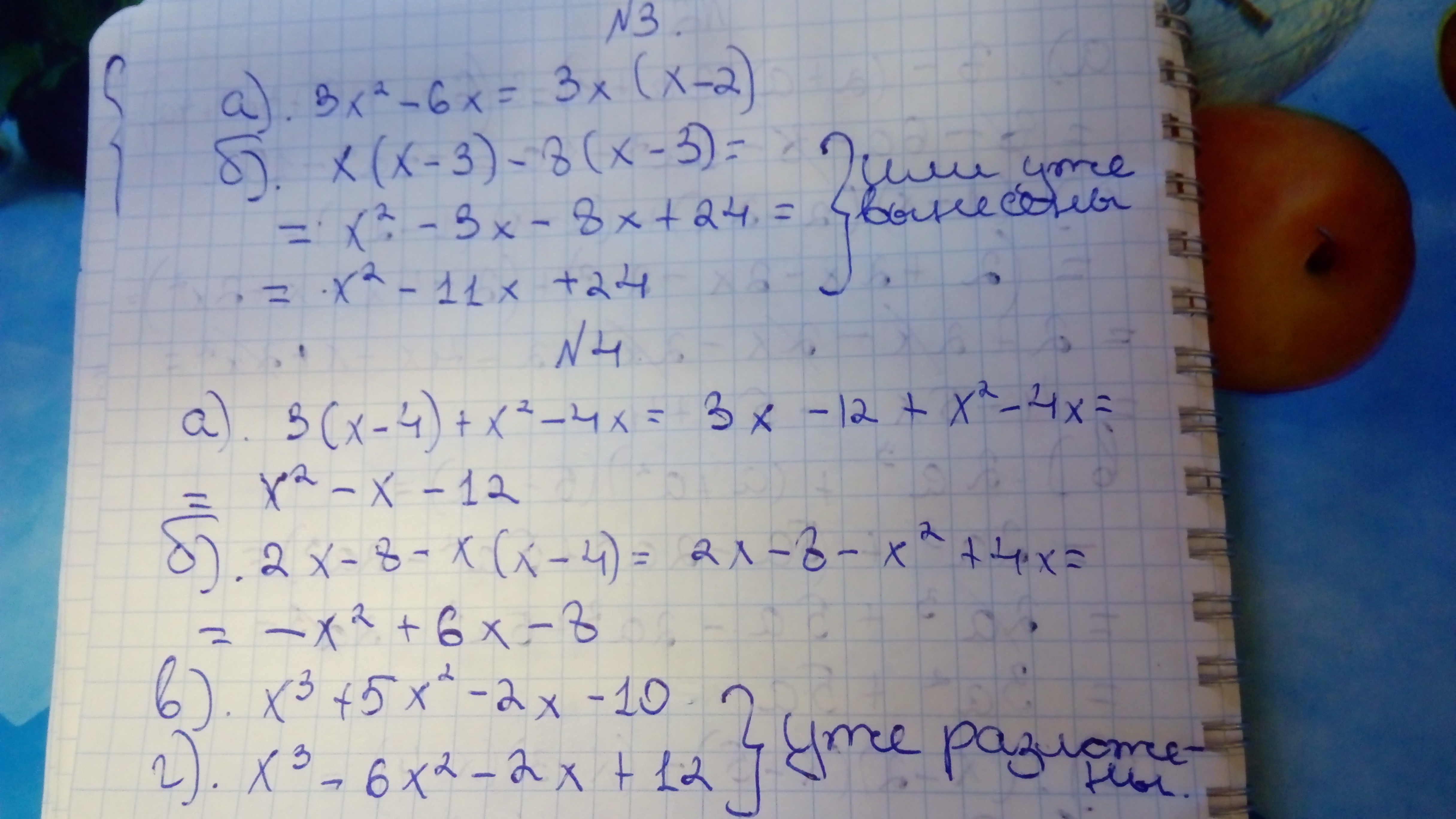 Пожалуйста. Только в 3-м номере уже общий множитель вынесен, либо же можно по-другому его вынести. В 4-м номере пункты В и Г уже разложены.