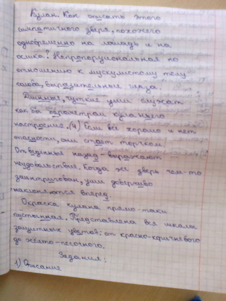 Дли_ые,чу_кие уши служат как бы б_рометром кулан_его настр_ения.(4).Если всё хорошо и нет опас_ости,они ст_ят торчком.Отв_денные наза_-выр_жают неудовольствие.Когда же зверь чем-то заинтр_гован,уши доверч_во наклоняются впере_.