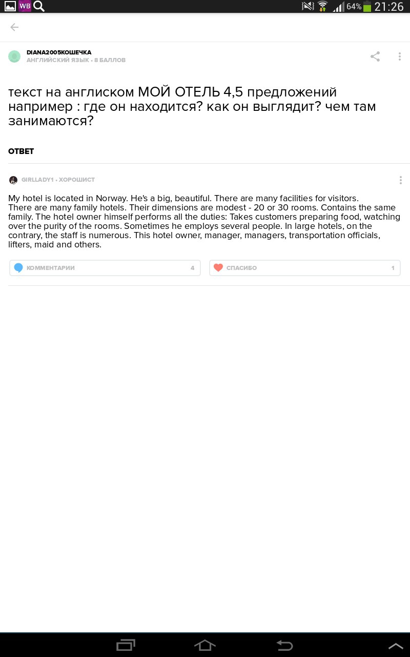 Мой отель находится в Норвегии. Он большой, красивый. Есть много возможностей для посетителей. Есть много семейных отелей. Их размеры скромные 20 или 30 номеров. Содержит ту же семью. Владелец отеля сам выполняет все обязанности: принимает клиентов, приготовление пищи, наблюдая за чистотой OFTHE комнат. Иногда он работает несколько человек. В крупных гостиницах. наоборот, персонал в большом количестве. Этот хозяин отеля, менеджер, менеджеры, транспортные чиновники.