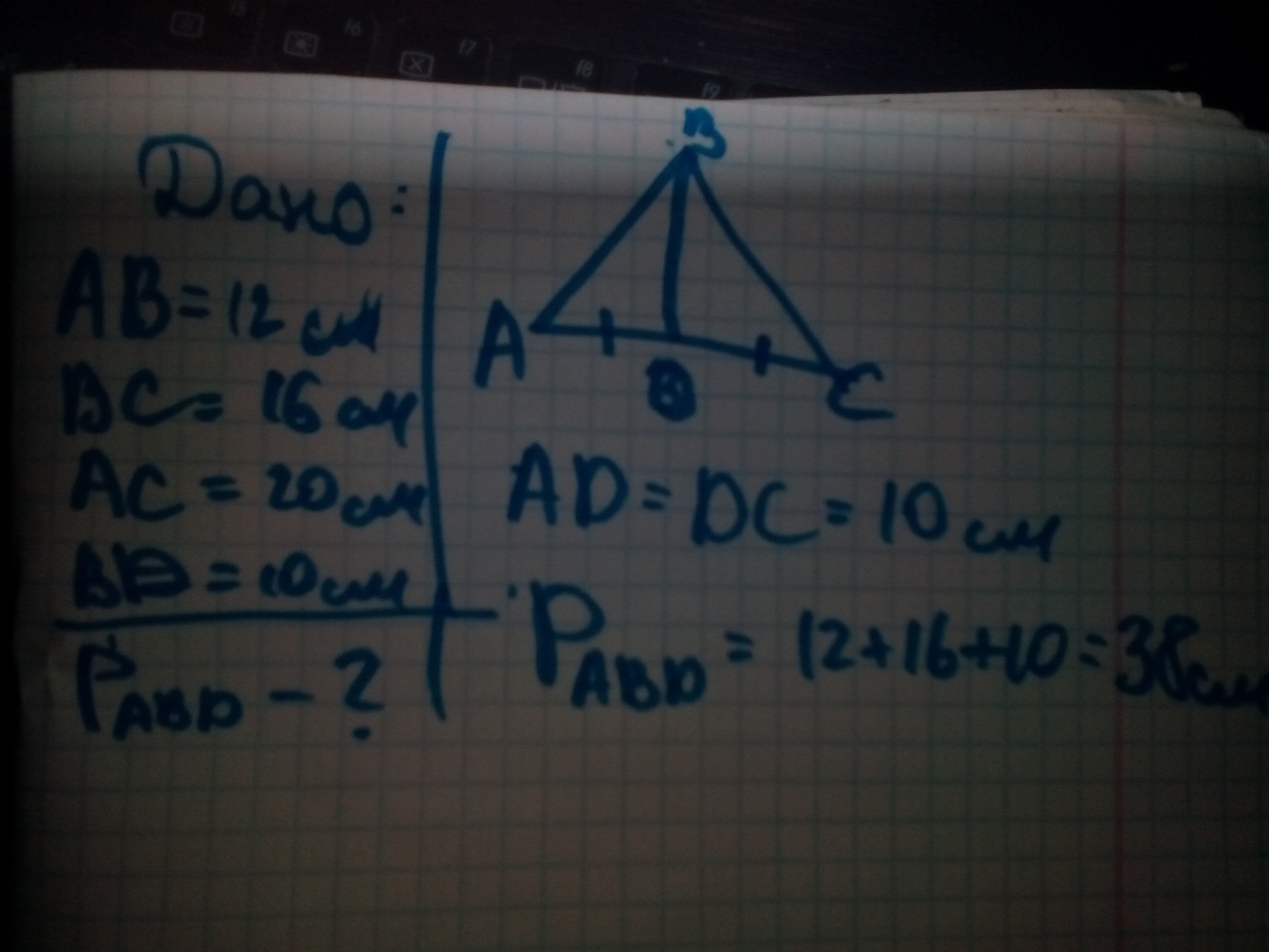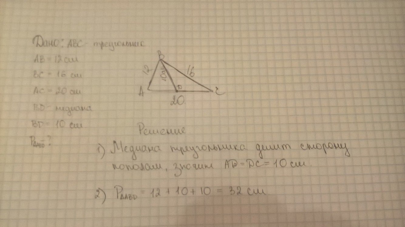 В треугольнике ABC стороны AB, BC и AC равны 12см,16см и 20см соответственно длина медианы BD равна 10см. Найдите периметр треугольника ABD.