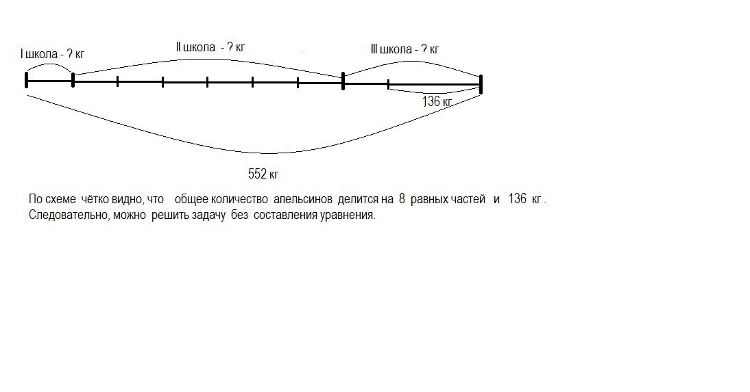 В три школы отправили 552 кг апельсинов, причём в одну школу отправили в 6 раз меньше чем чем во вторую, и на 136 кг меньше, чем в третью. Сколько кг апельсинов отправили в каждую школу. Решение не через х