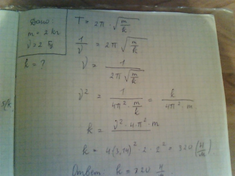 груз массой 2кг подвешен на пружине и совершает колебания вдоль вертикальной оси с частотой 2 Гц. найдите жесткость пружины