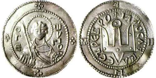 На лицевой стороне монеты – изображение сидящего на троне князя в шапке, украшенной подвесками и увенчанной крестом. В правой руке князя – крест на длинном древке, над левым плечом находится княжий знак в виде трезубца. Вокруг изображения – круговая надпись, читаемая справа налево «Владимир на столе». Вершины букв обращены к центру монеты, по краю – бусинный ободок.