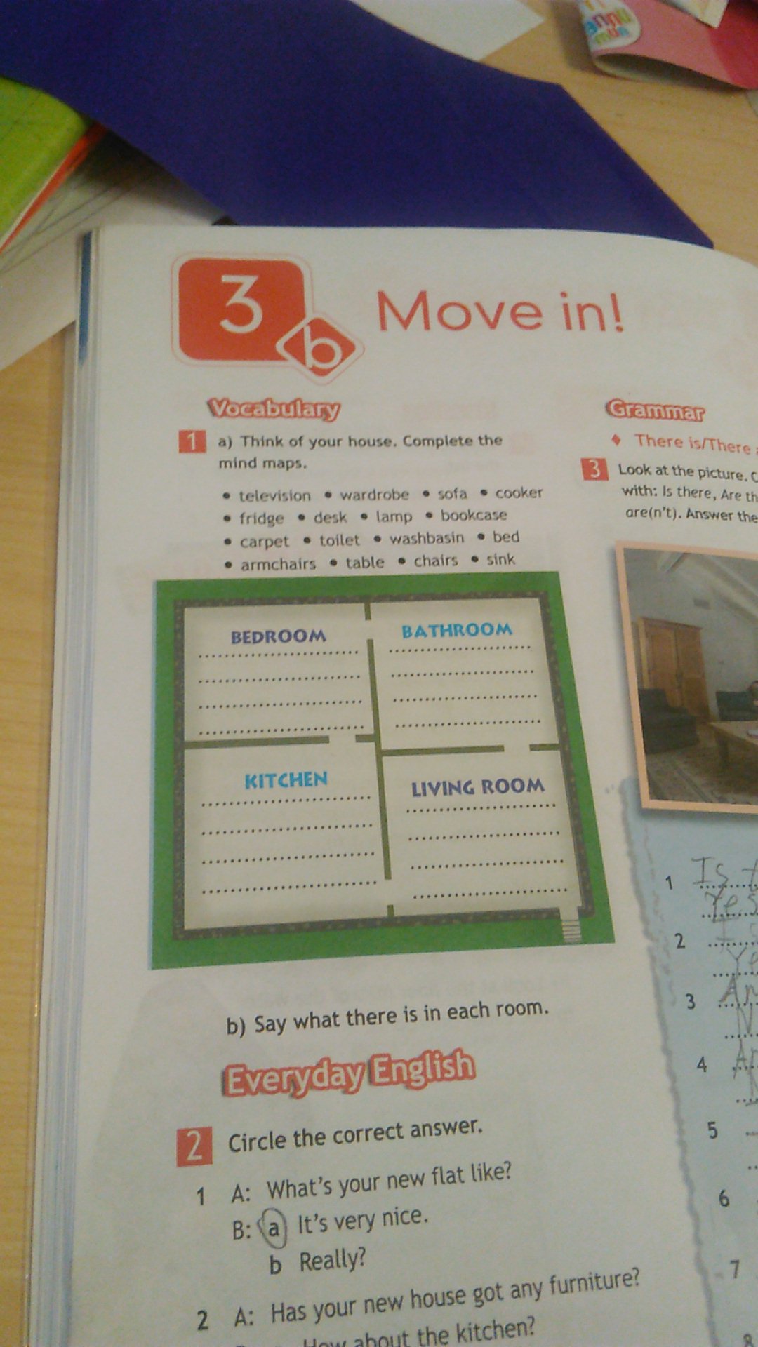 Там где bedroom пиши... bed, desk, bookcase, television. Там где Bathroom пиши.. toilet, washbasin.. Там где Kitchen пиши frige, sink, table, chairs, Там где Living room пиши... armchairs,sofa,carpet,lamp. Помогло? У меня такой же учебник, и я делала вчера тоже самое....