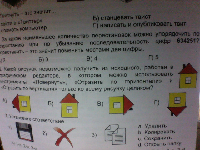 какой рисунок невозможно получить из исходного, работая в графическом редакторе, в котором можно использовать инструменты "повернуть", "отразить по горизонтали" и "отразить по вертикали" только ко всему рисунку целиком?