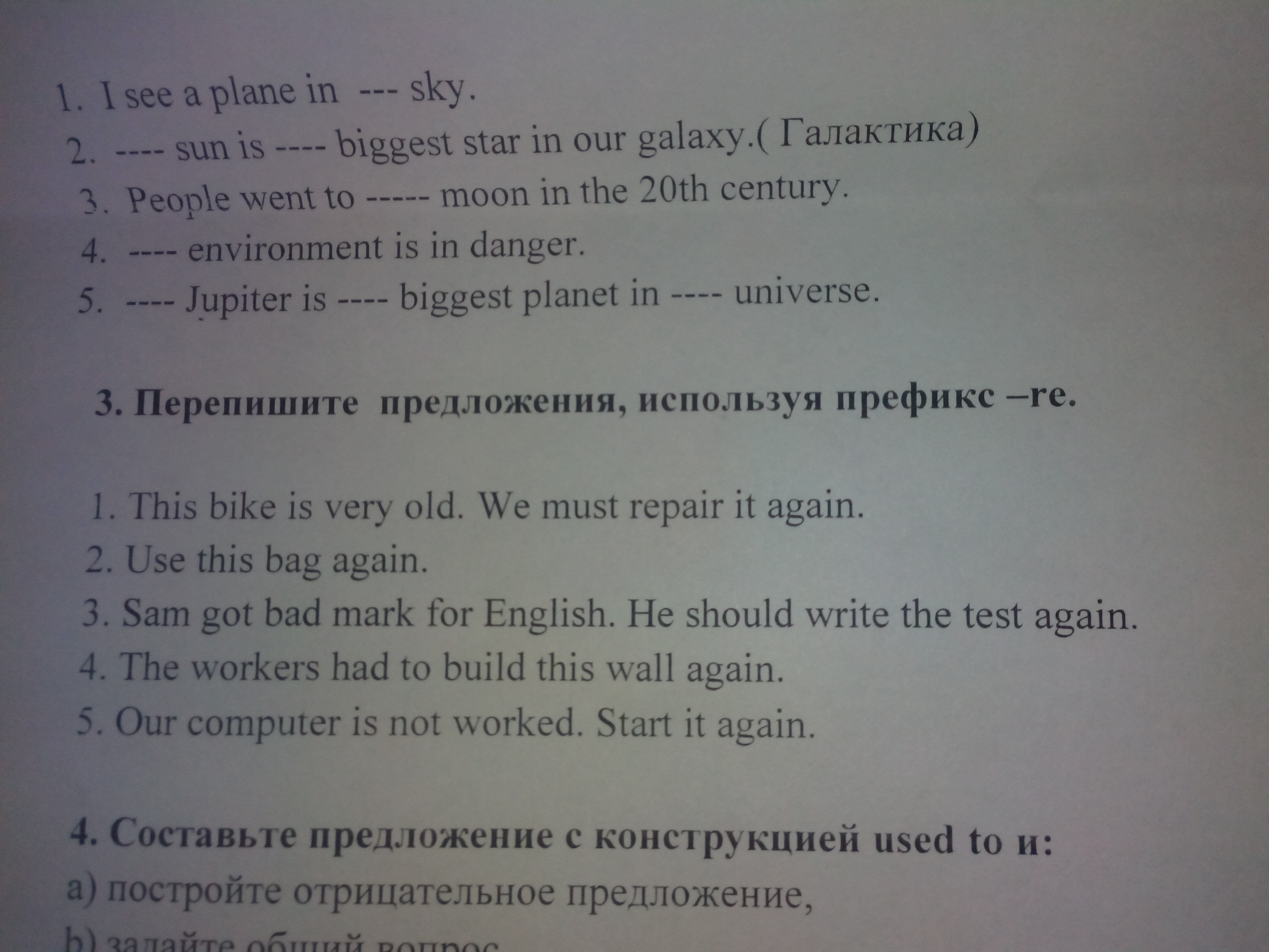 Переписываешь предложения, как в задании написано, просто меняешь глаголы на те, что я тебе написала, с приставкой re-
