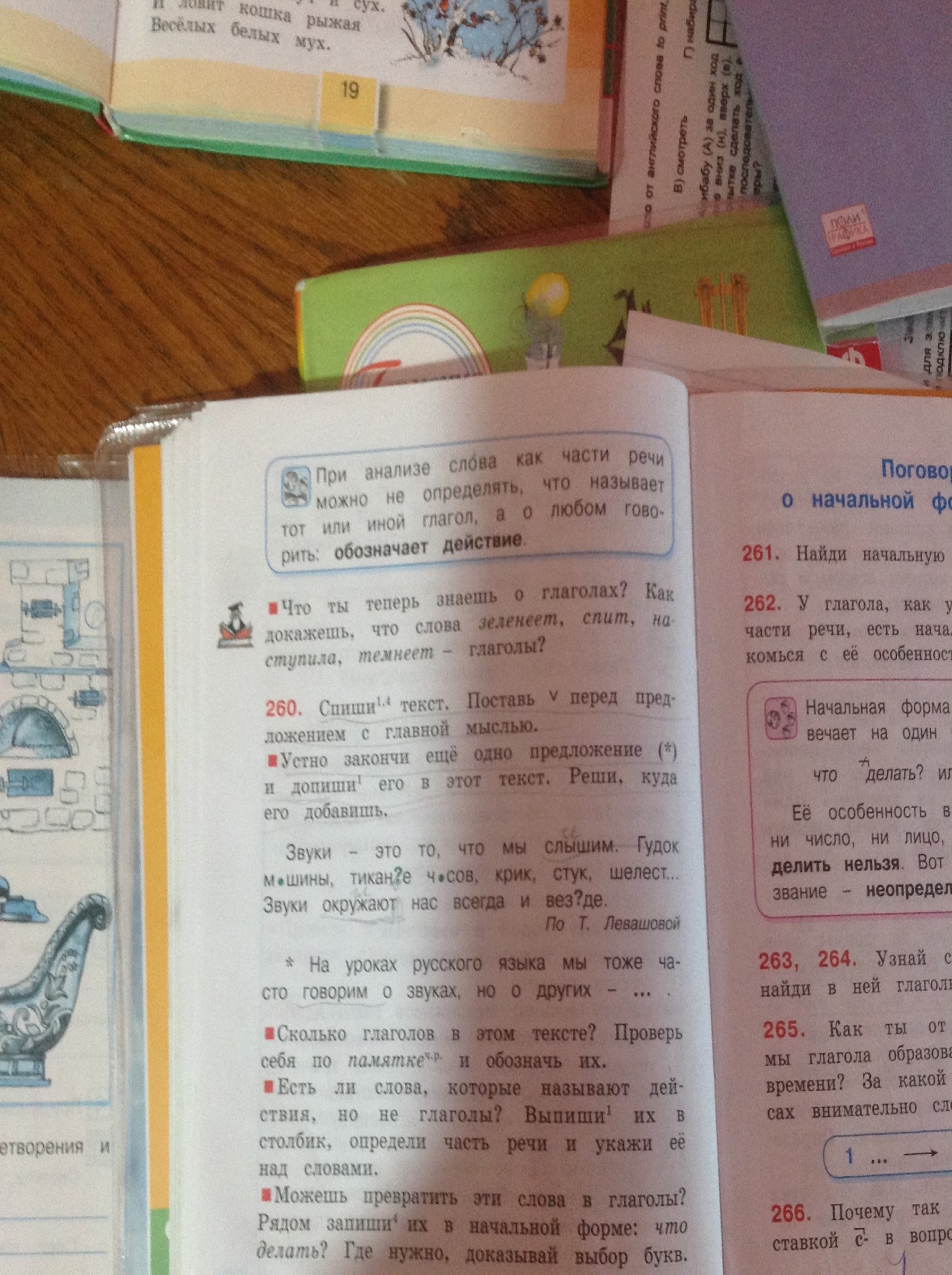 1 предложение с главной мыслью. глаголы-слышим,окружают. новые глаголы-гудеть,кричать,стучать,шелестеть.
