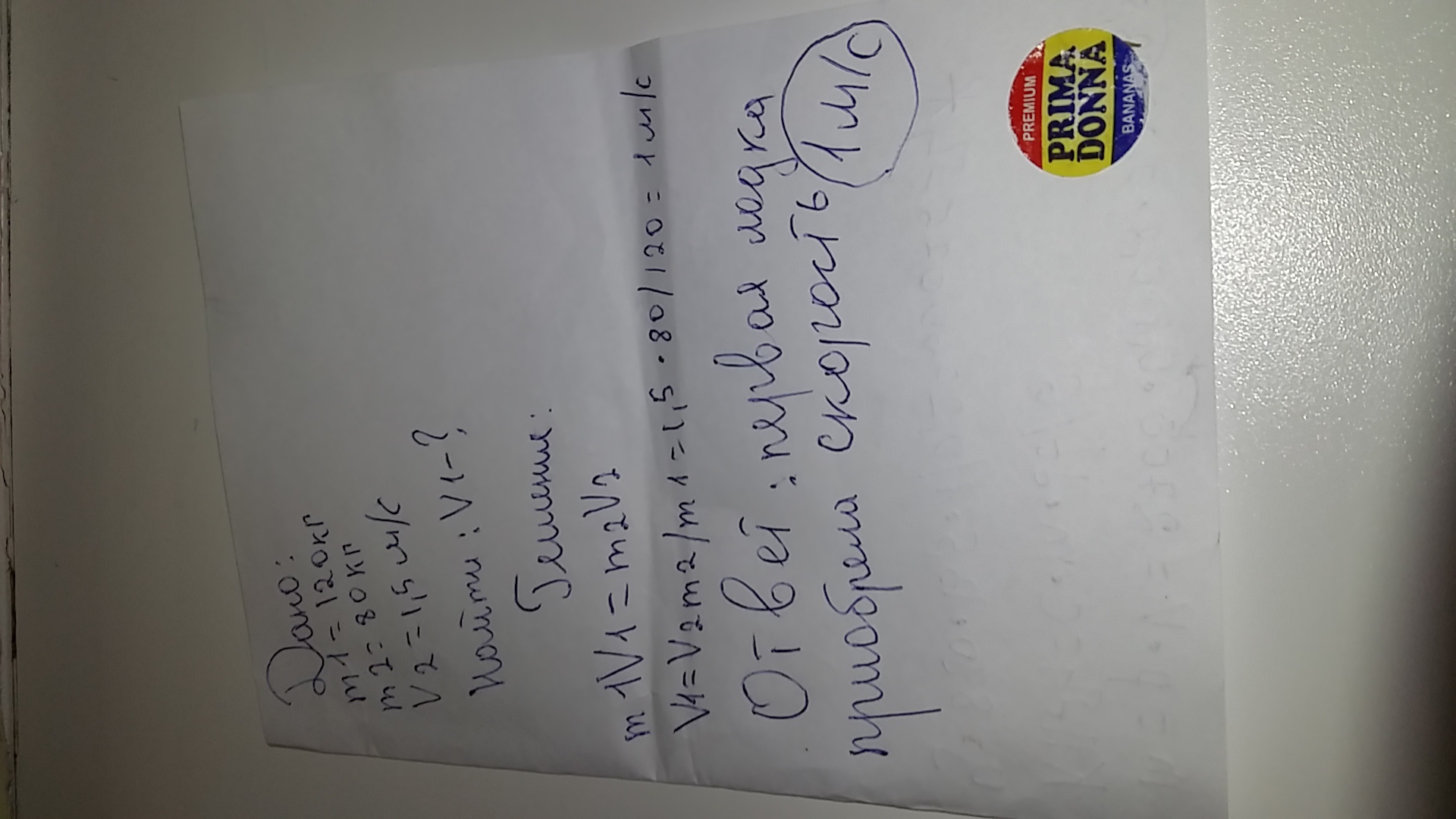 в двух неподвижных лодках находятся мальчики.Масса первой лодки с мальчиком составляет 120 кг, второй 80 кг. после того как мальчик на второй лодке оттолкнул от себя первую, его лодка преобрела скорость, равную 1.5 метров в секунду. какую скорость преобрела первая лодка? С дано и Решение!!!