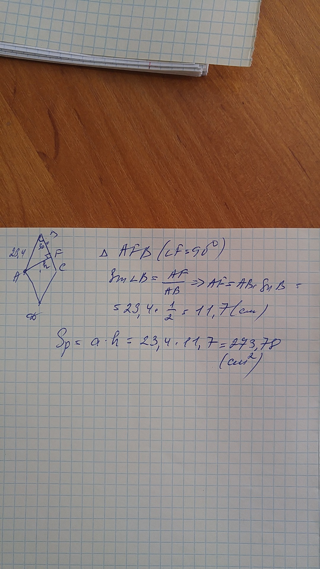 Сторона ромба равна 23,4см,а один из углов ромба равен 30 градусов. Найдите площадь ромба.С решением