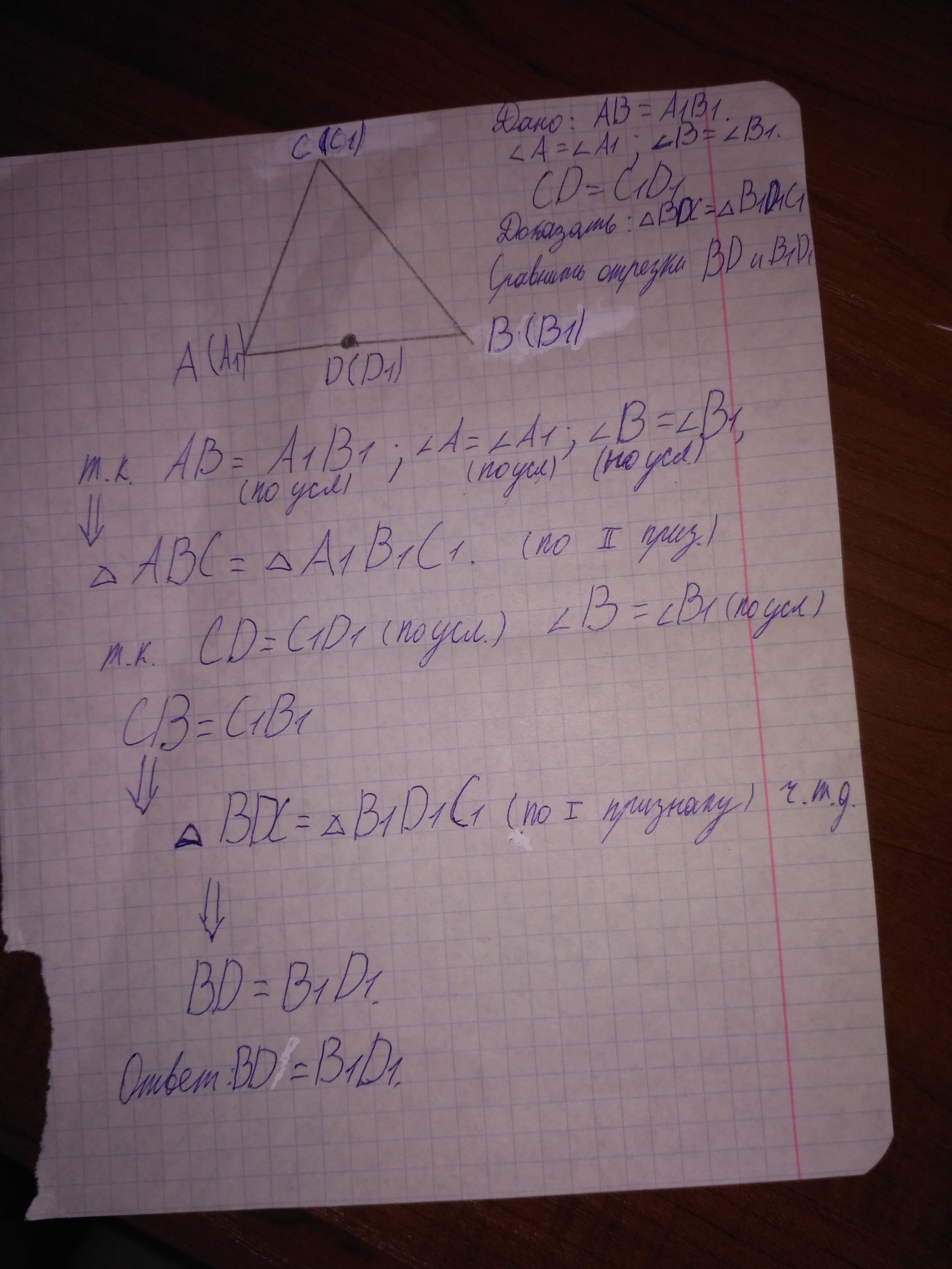 В треугольниках АВС и А1Б1С1 стороны АВ и А1В1 равны и угол А=углу А1, угол В=углуВ1 На сторонах АС иА1С1 отмечены точки D и D1 так, что СD=C1D1 Докажите, что треугольники BDC и B1D1C1 равны и сравните отрезки BD и B1D1
