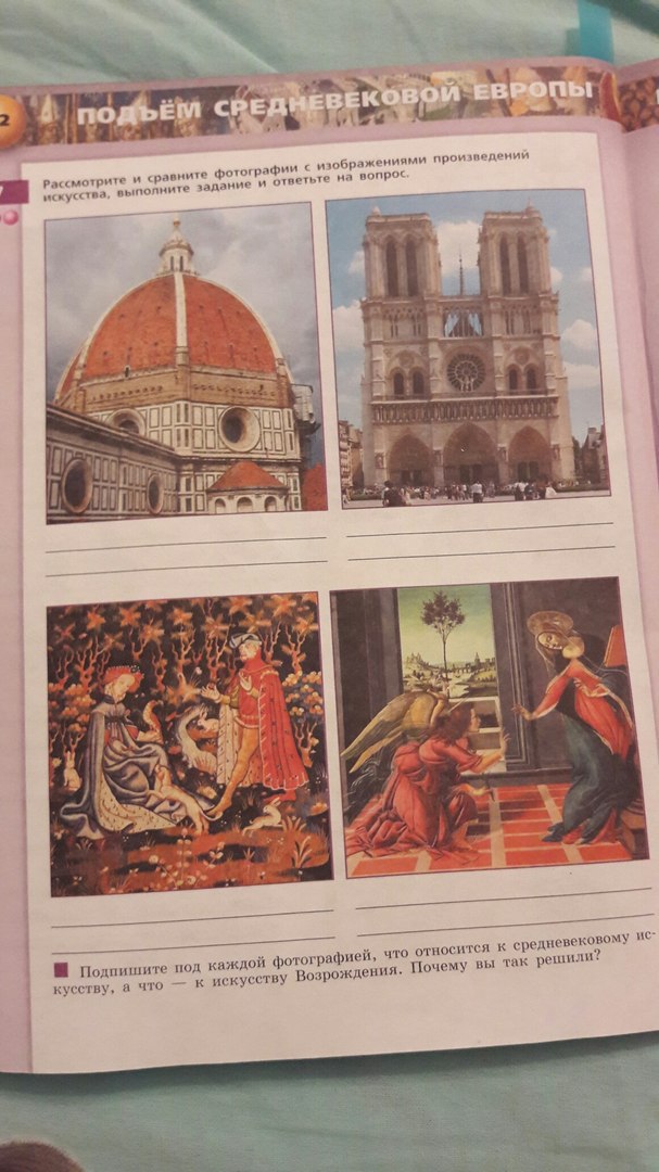"Подпишите под каждой фотографией, что относится к средневековому искусству а что - к искусству Возрождения. Почему вы так решили?"