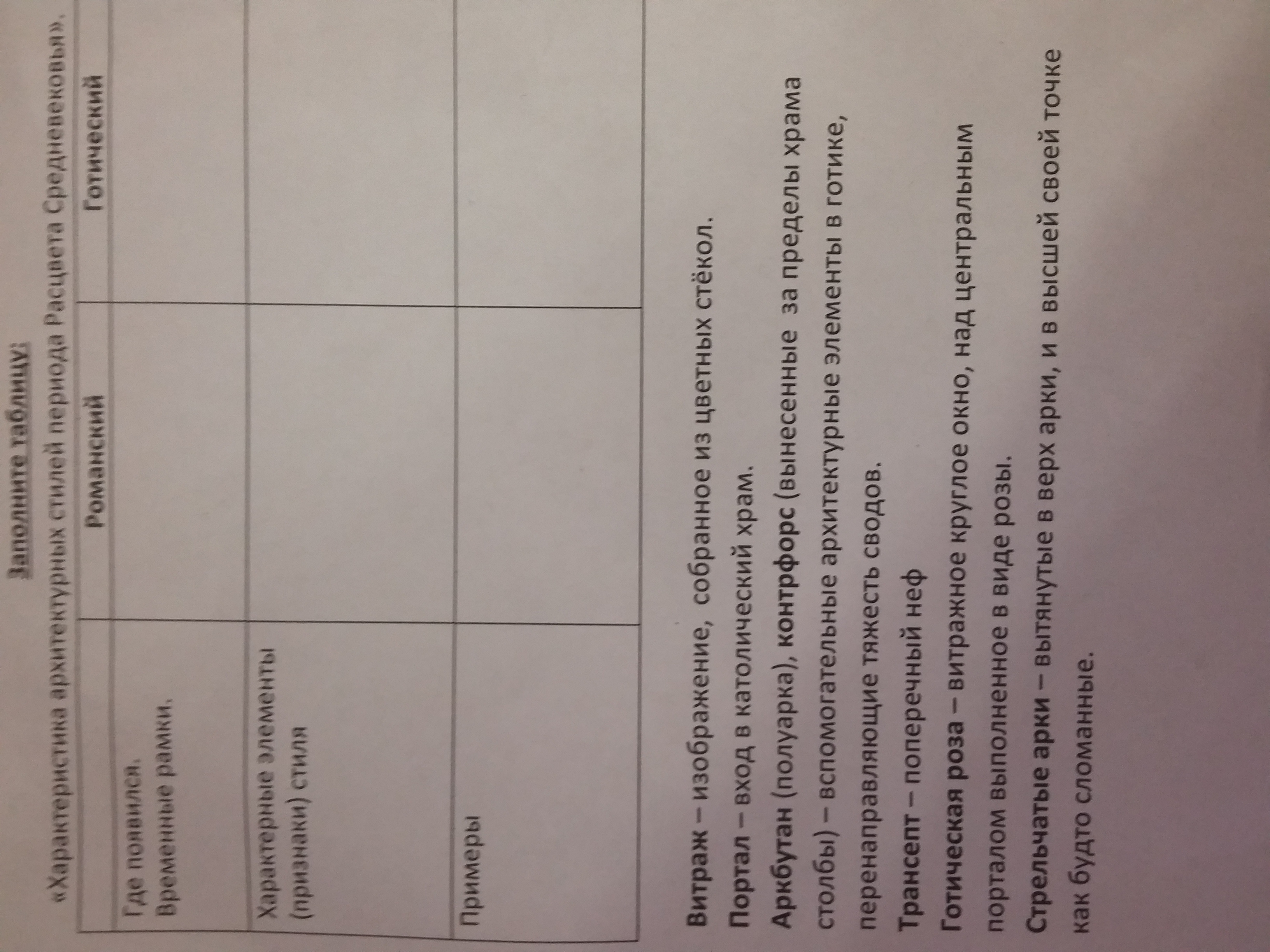 Массивность, тяжеловестность, грузность, крепостной характер, основное выразительное средство - стела с узкими проёмами - крестово -купальная система. Толстые стены, узкие окна- бойниц в монастырях и замках. Главным элементом композиции - донжон. Вокруг нее располагались остальные постройки, составленные из простых геометрических форм - кубов, призм, цилиндров.