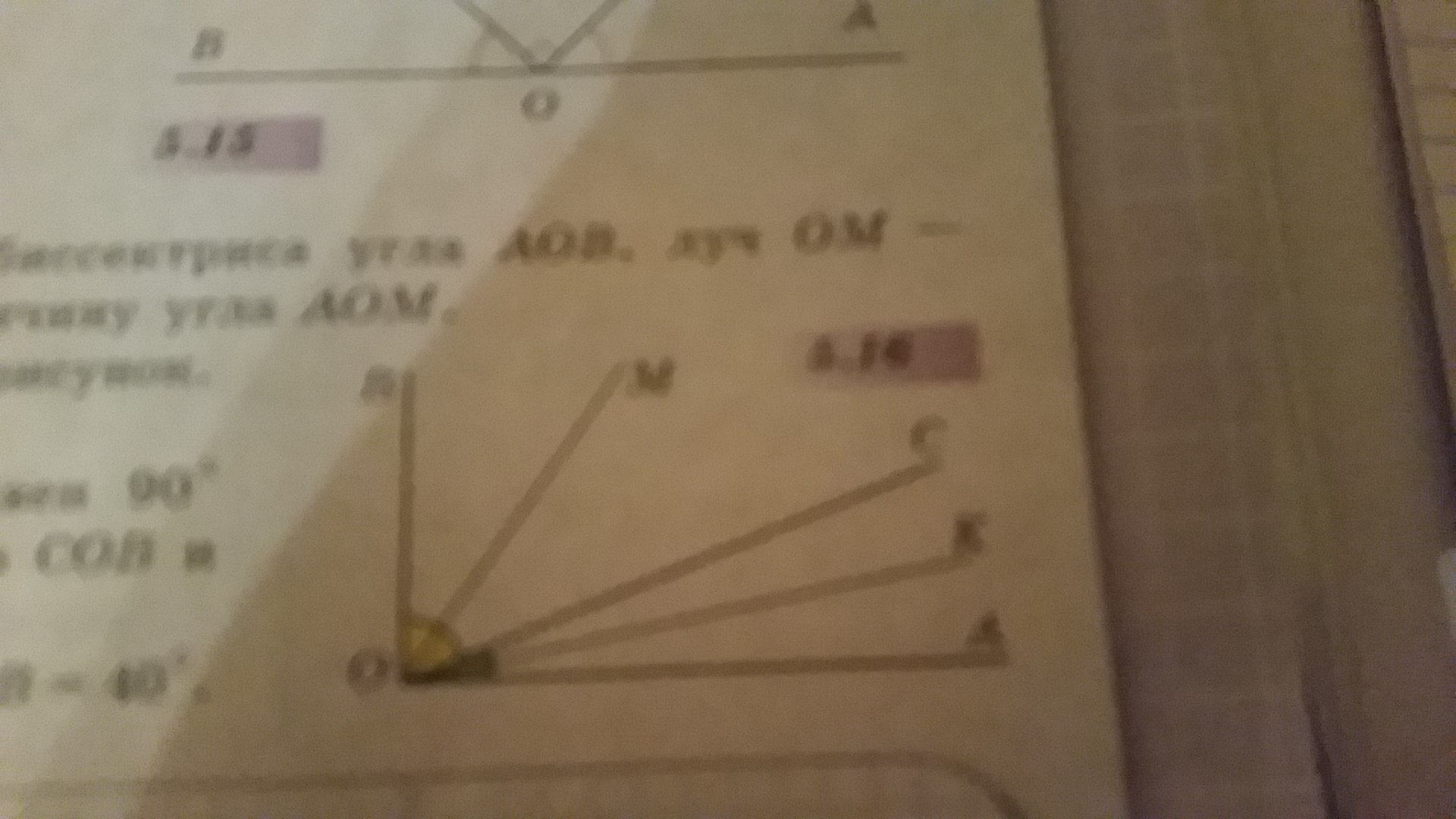 на рисунке 5.16угол АОВ равен 90°лучи ОМ и ОК биссектрисыуглов СОВ и СОВ.найдите угол МОК.решите задачупри условии что АОВ=40°