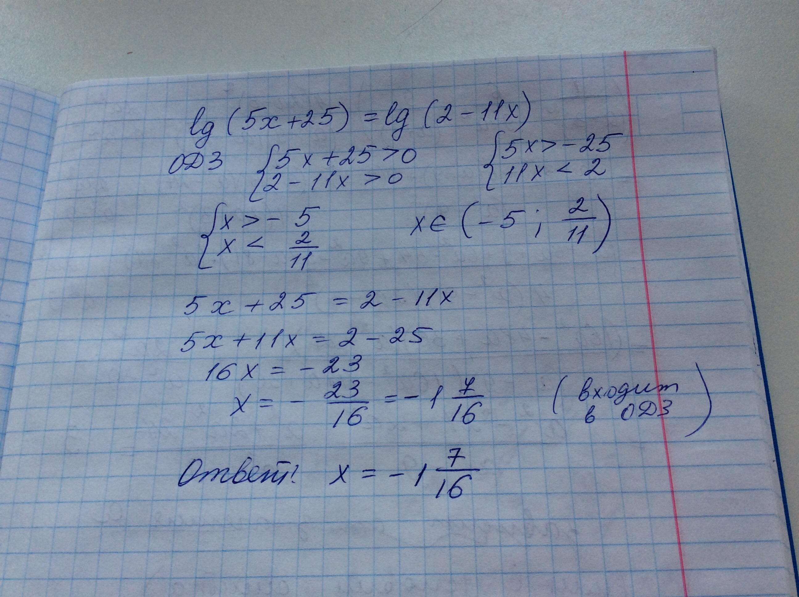 Решить логарифм Lg(5x+25)=Lg(2-11x)