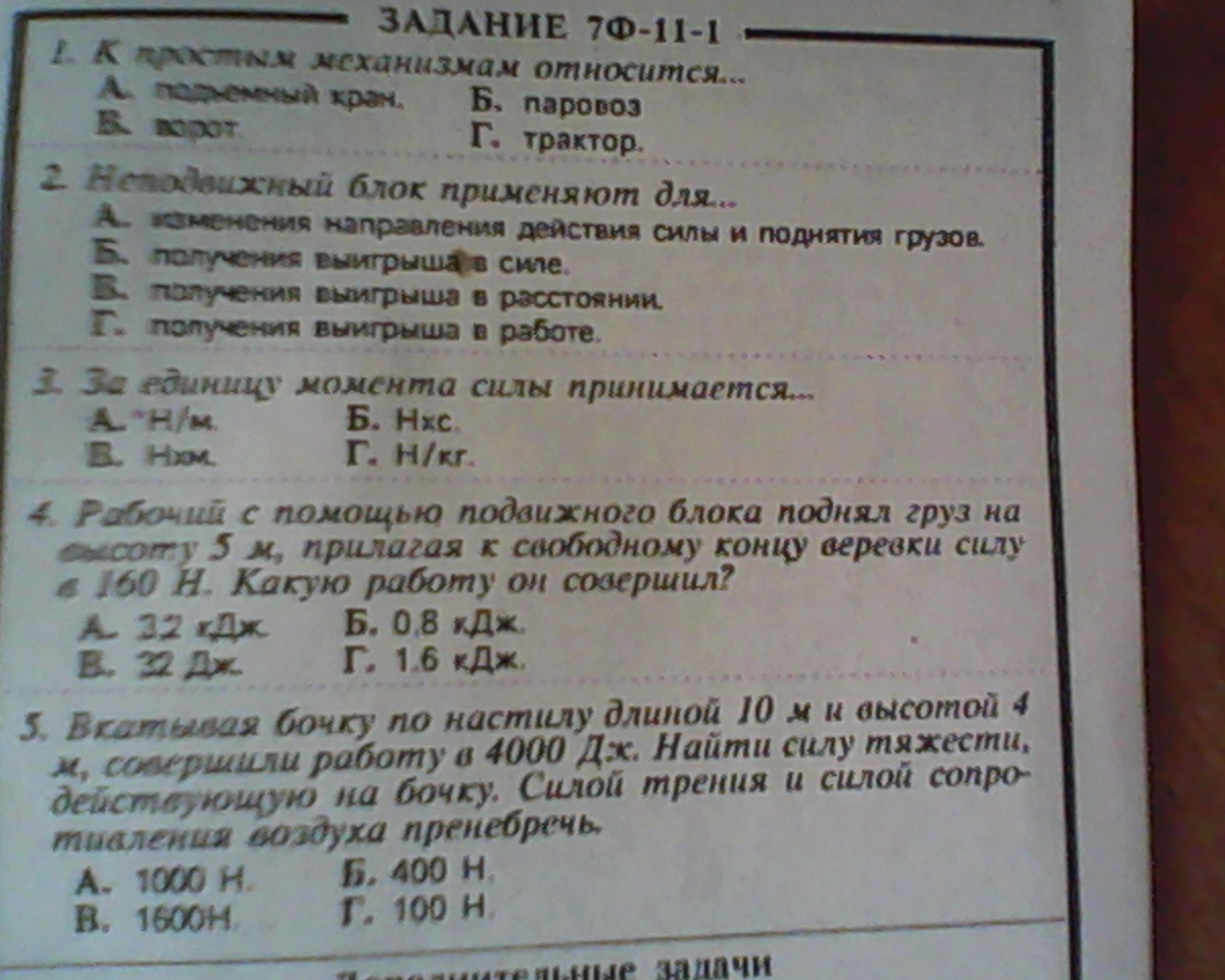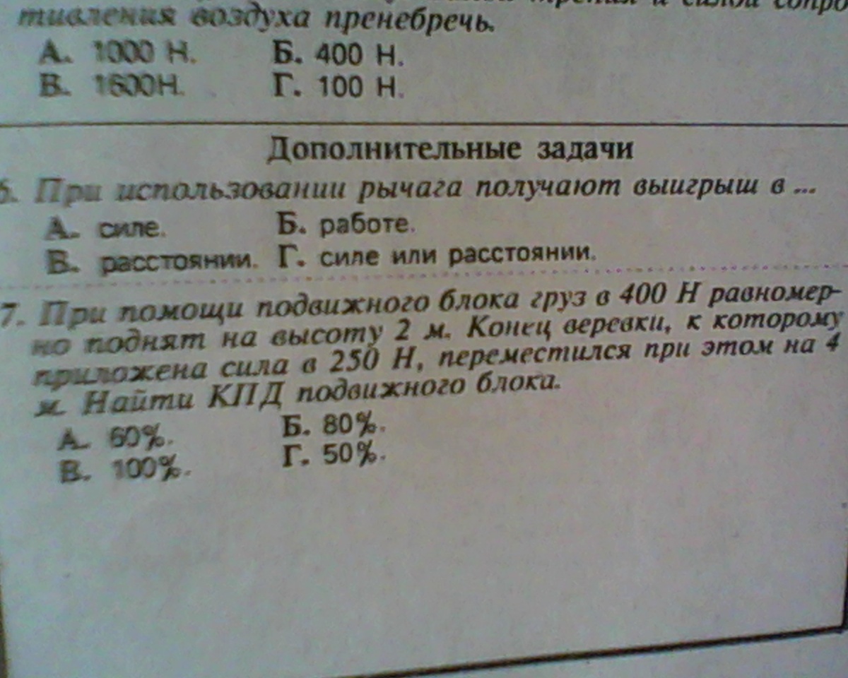 7. n=Aп/Аз=(400Н*2м)/(250Н*4м)=0,8=80% (Б)