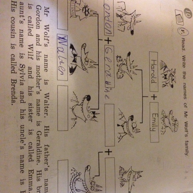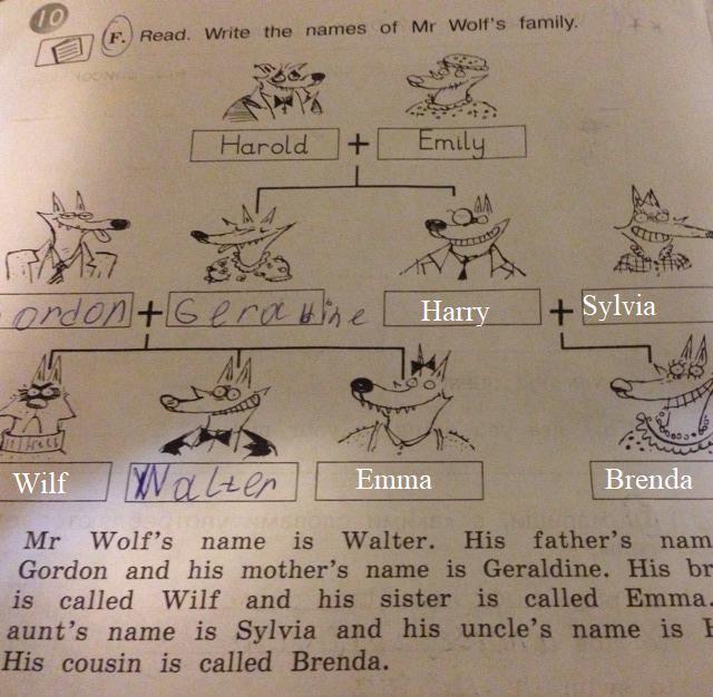 Мистера Волка зовут Уолтер. Его отца зовут Гордон и его мать зовут Джеральдина. Его брата зовут Уилф и его сестру зовут Эмма. Его тетю зовут Сильвия, а его дядю зовут Гарри. Его двоюродную сестру зовут Бренда.