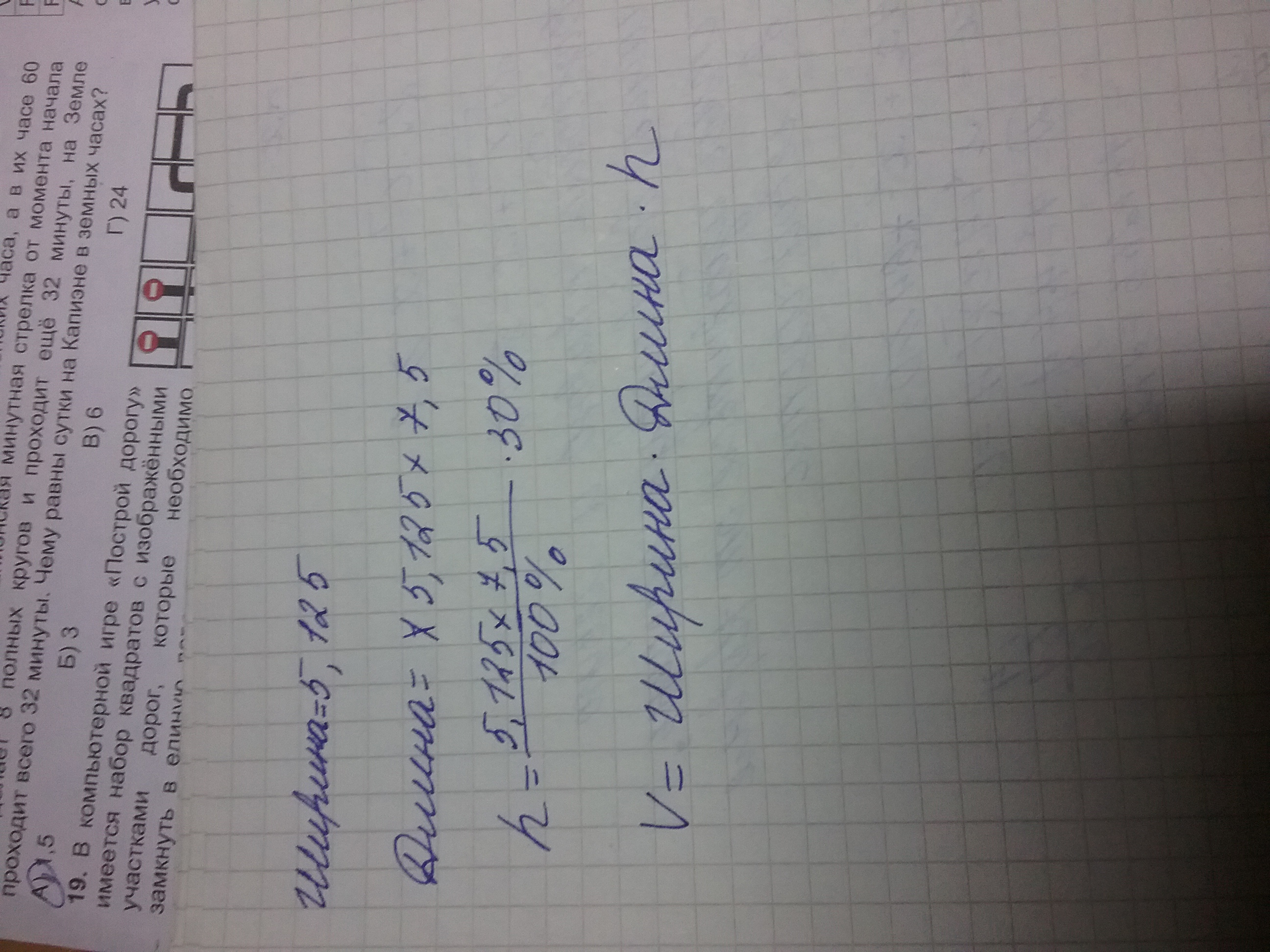 Ширина прямоугольного параллепипеда равна 5 ⅛ см,его длина в 7 ½ раза больше ширины, а высота составляет 30% длины. Вычислите объём параллепипеда.