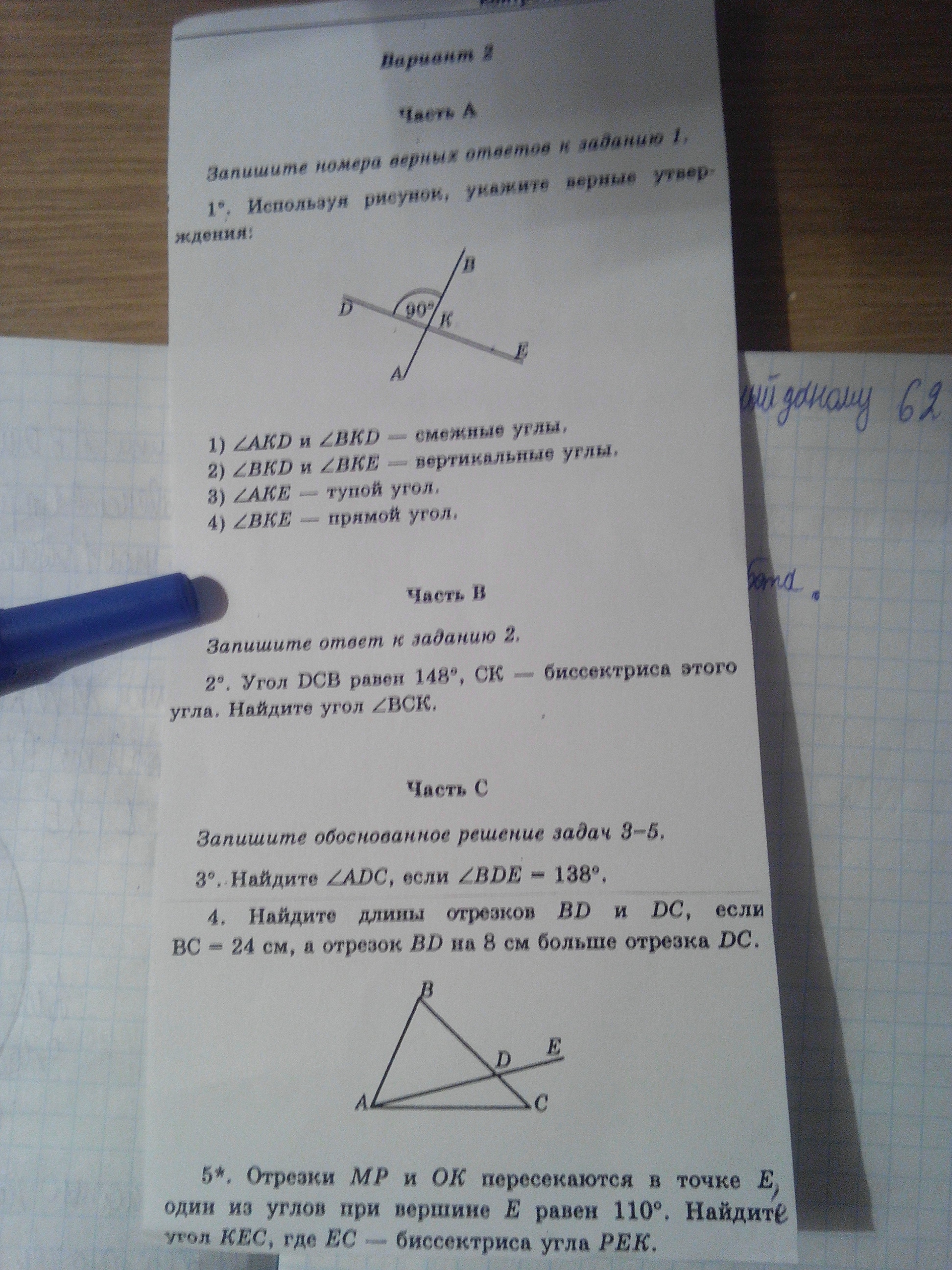 5. тут по разному рассуждать можно :если это угол PEK=110,то биссектриса разделит его пополам и угол KEC=55, а если угол PEK всего лишь смежных углу 110, то он равен:180-110=70 и его биссектриса разделит на угол КЕС 45.