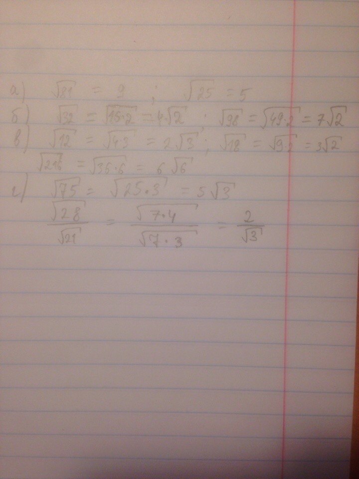 помогите пожалуйста!!! А1) а)Вычислите корень 81*корень 25 б)корень 32*корень 98 в)корень 12*корень 18 корень 216 г)корень 75*корень 28 дробь внизу под чертой корень 21
