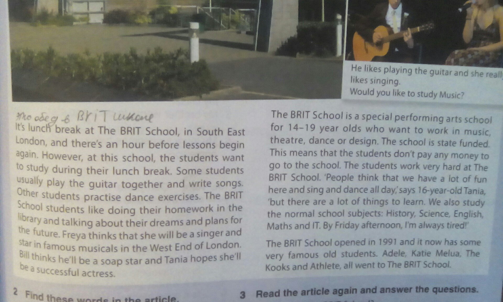 BRIT School является специальным исполнительских искусств школа для 14-19-летних, которые хотят работать в области музыки, театра, танца или дизайна. Школа финансируется государством. Это означает, что студенты не платят никаких денег, чтобы пойти в школу. Студенты работают очень трудно в школе BRIT. Люди думают, что у нас есть много удовольствия здесь и петь и танцевать весь день, говорит 16-летний Тания ", но есть много вещей, чтобы учиться Мы также изучать обычные школьные предметы:. История, наука, английский Математика и IT в пятницу во второй половине дня, я всегда устал! Брит школа открылась в 1991 году, и теперь он имеет несколько очень известных старых студентов. Адель, Кэти Мелуа, The Kooks и спортсмен, все пошли в BRIT School.