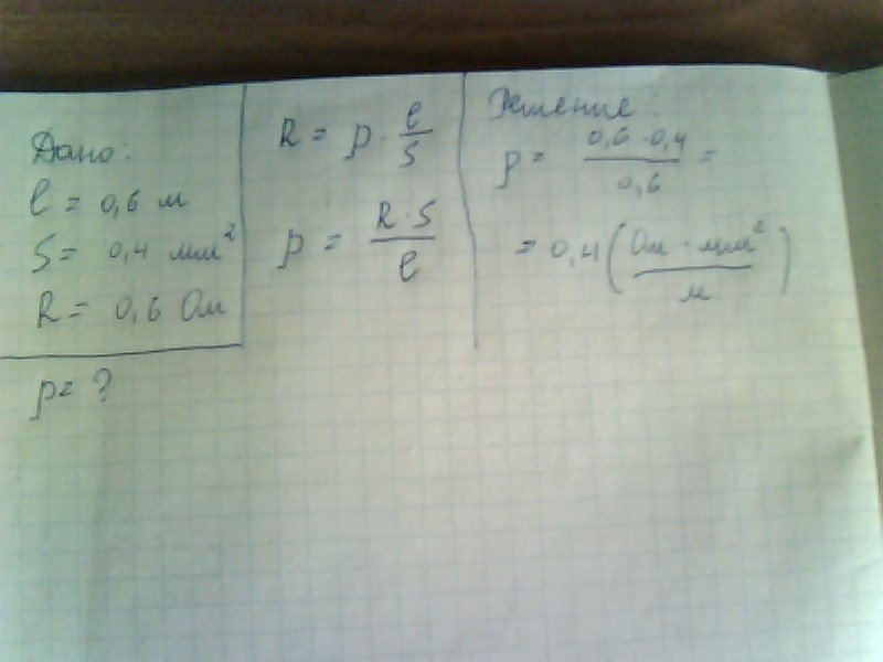 определите. удельное сопротивление проводника если его длина 0,6м площадь поперечного сечения 04мм^2 а сопротивление 0.6 Ом решите пожалуйста