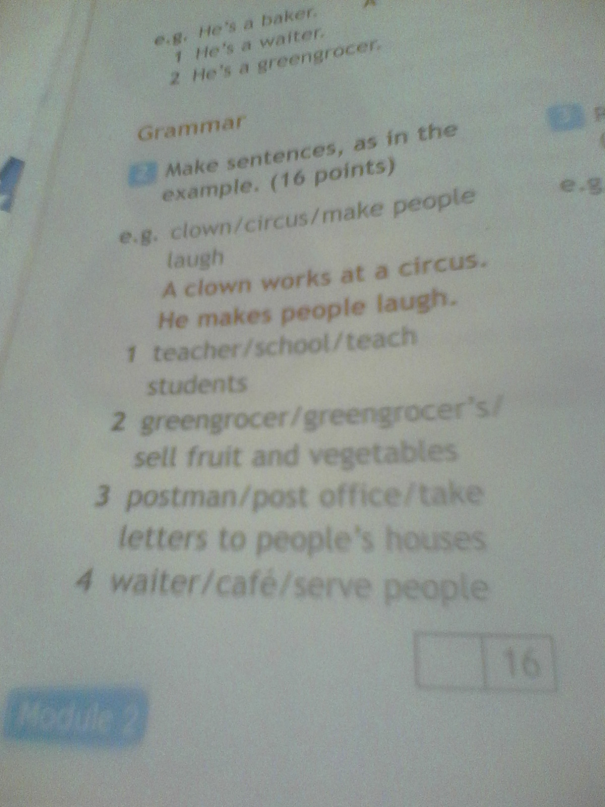 1) A teacher works at school. Teacher teaches students. 2) A greengrocer works at greengrocer's. He sells fruit and vegetables. 3) A postman works at the post office. He takes letters to people's houses. 4) A waiter works in a cafe. He serves people.