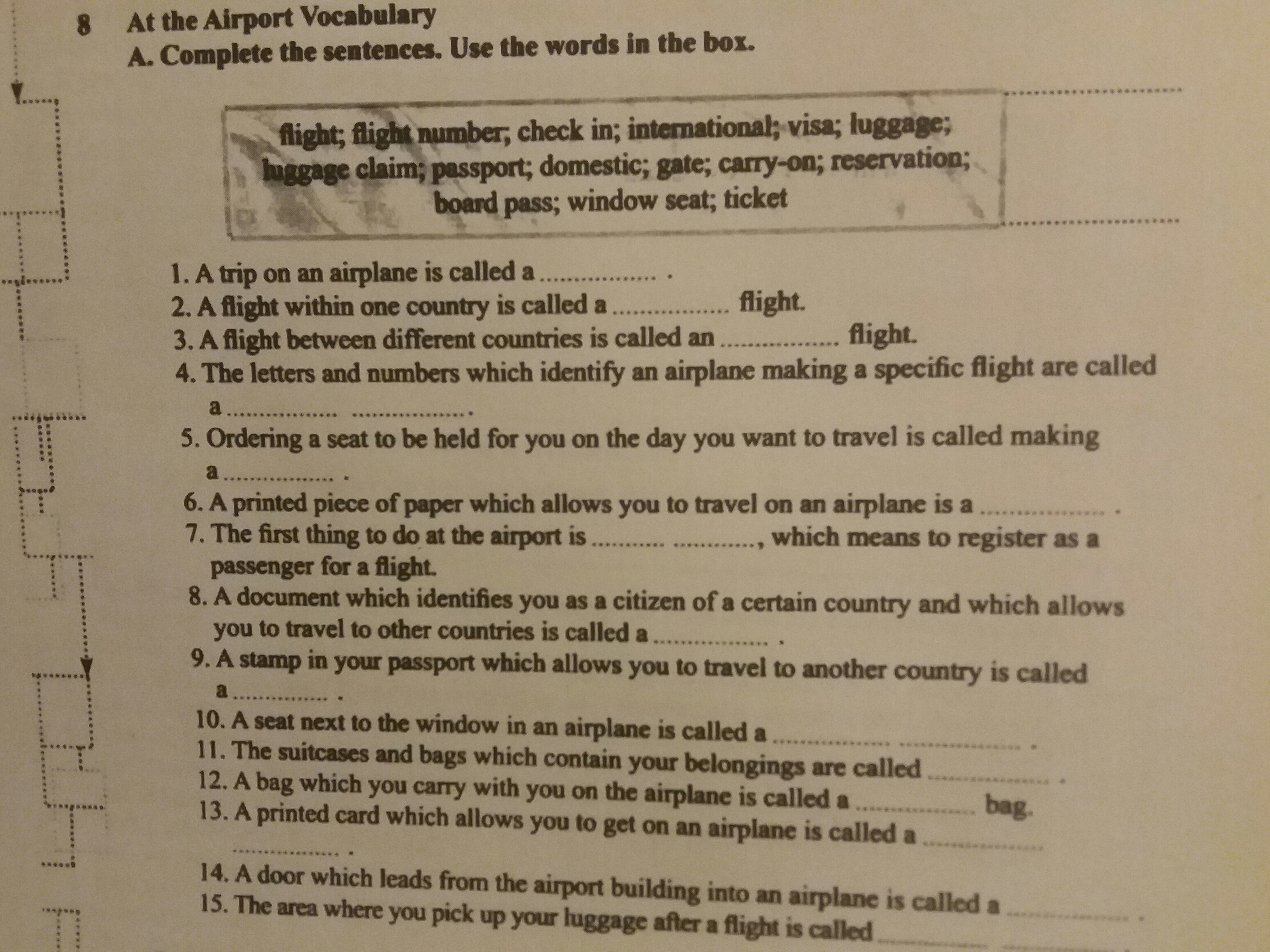 1.flight 2.domestic 3.international 4.flight number 5.reservation 6. Ticket 7. Check in 8. Passport 9. Visa 10. Window seat 11. Luggage 12. Carry on 13. Board pass 14. Gate 15. Luggage