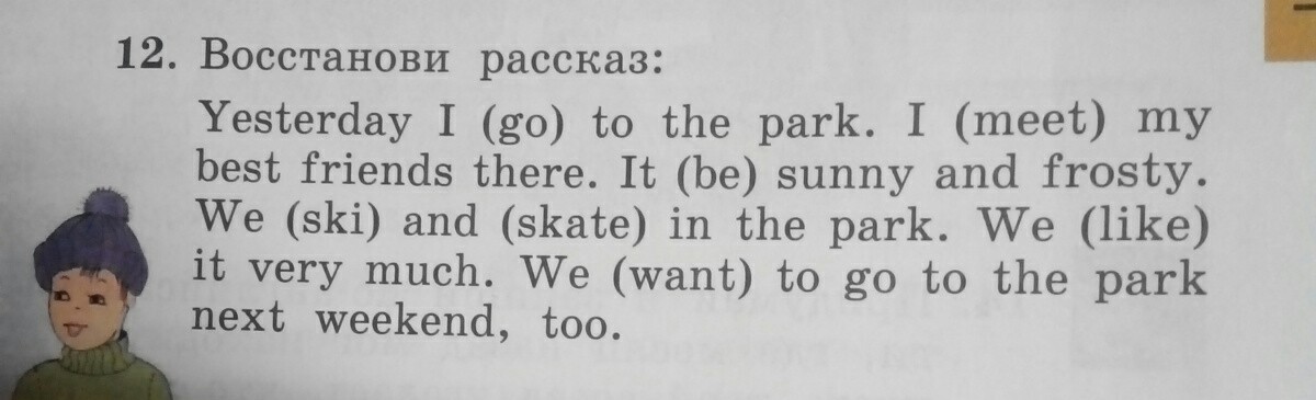 Yesterday i went to the park. I met my best friends there. It was sunny and frosty. We skied and skated in the park. We like it very much. We want to go to the park next weekend, too.