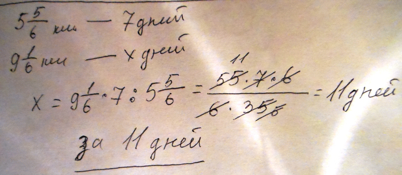 Помогите решить ещё одну задачу..На прокладку 5 5/6 км шоссе дорожная бригада затратила 7 дней.За сколько дней бригада сможет продолжить 9 1/6 км шоссе? С дробью