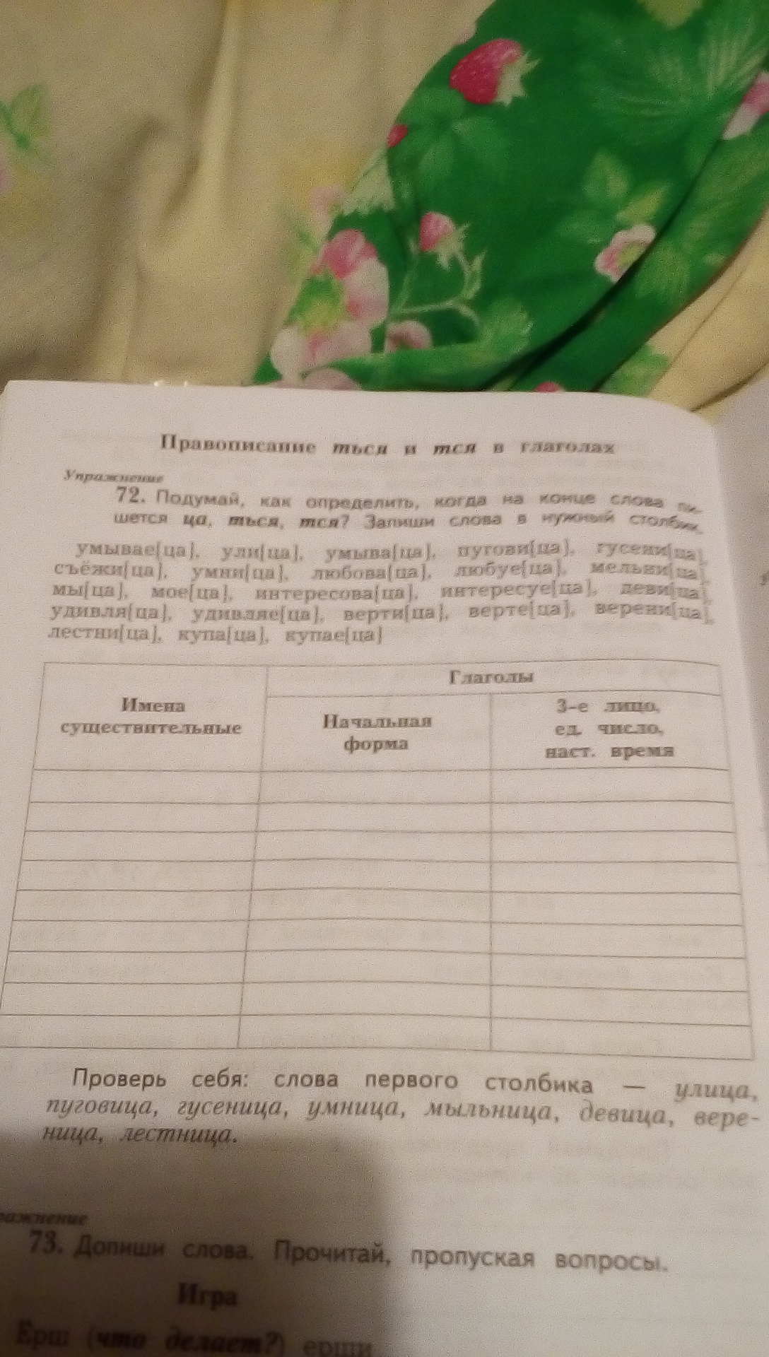 Умывается ,улица,умываться,пуговица,гусеница,съежиться,умница,любоваться,любуется,мельница,мыться,моется,интересоваться,интересуется,девица,удивляться,удивляется,вертится,вертеться,вереница,лестница, купаться,купается.