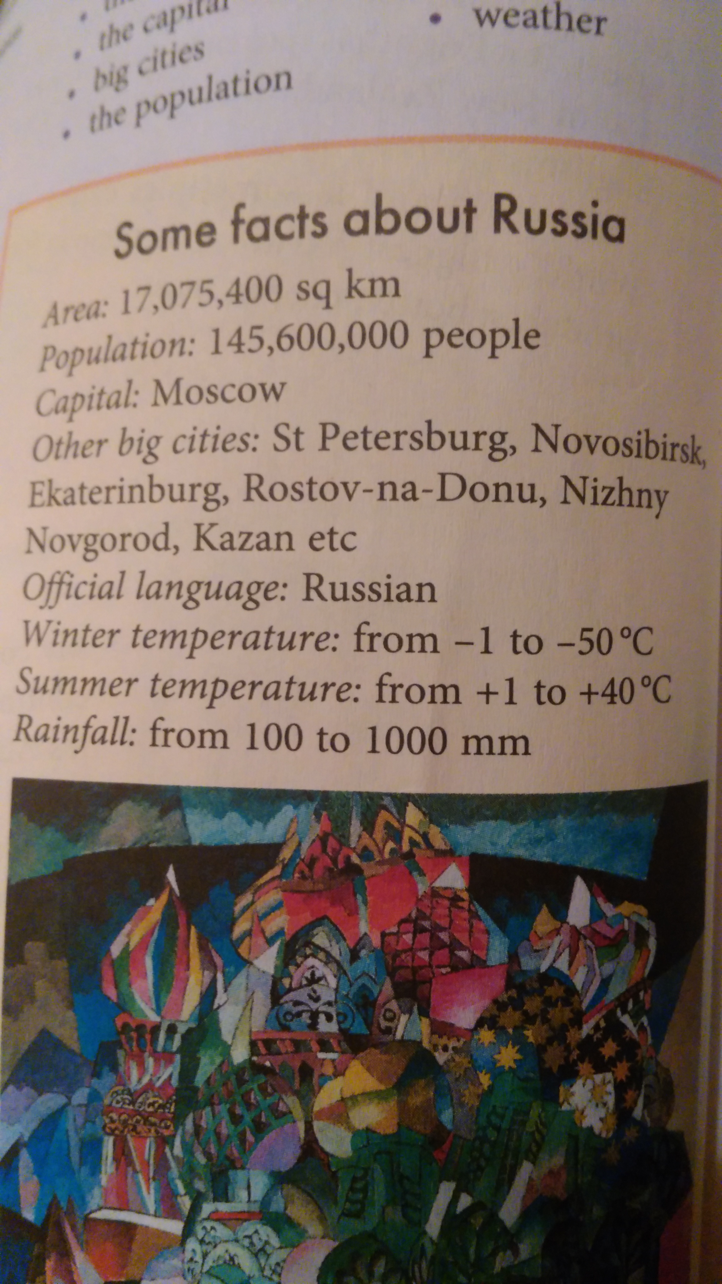 my COUNTRY IS RUSSIA.AREA OF RUSSIA IS 17,075,400 SQ KM.pOPULATION IN THIS COUNTRY 145,600,000 PEOPLE.THE CAPITAL OF RUSSIA IS MOSCOW CITY.STPETERBURG,NOVOSIBIRSK,EKATERINBURG,ROSTOV NA DONU,NIZHNY NOVGOROD,KAZAN OTHER BIG SITIES IN COUNTRY.OFFICIAL LANGUECH OF RUSSIA IS RUSSIAN.THE WINTER TEMPERATUR FROM -1 TO -50C .SUMMER TEMPERATURE FROM +1TO +40C.RAINFULL FROM 100 TO 1000 MM.I LOVE RUSSIA!