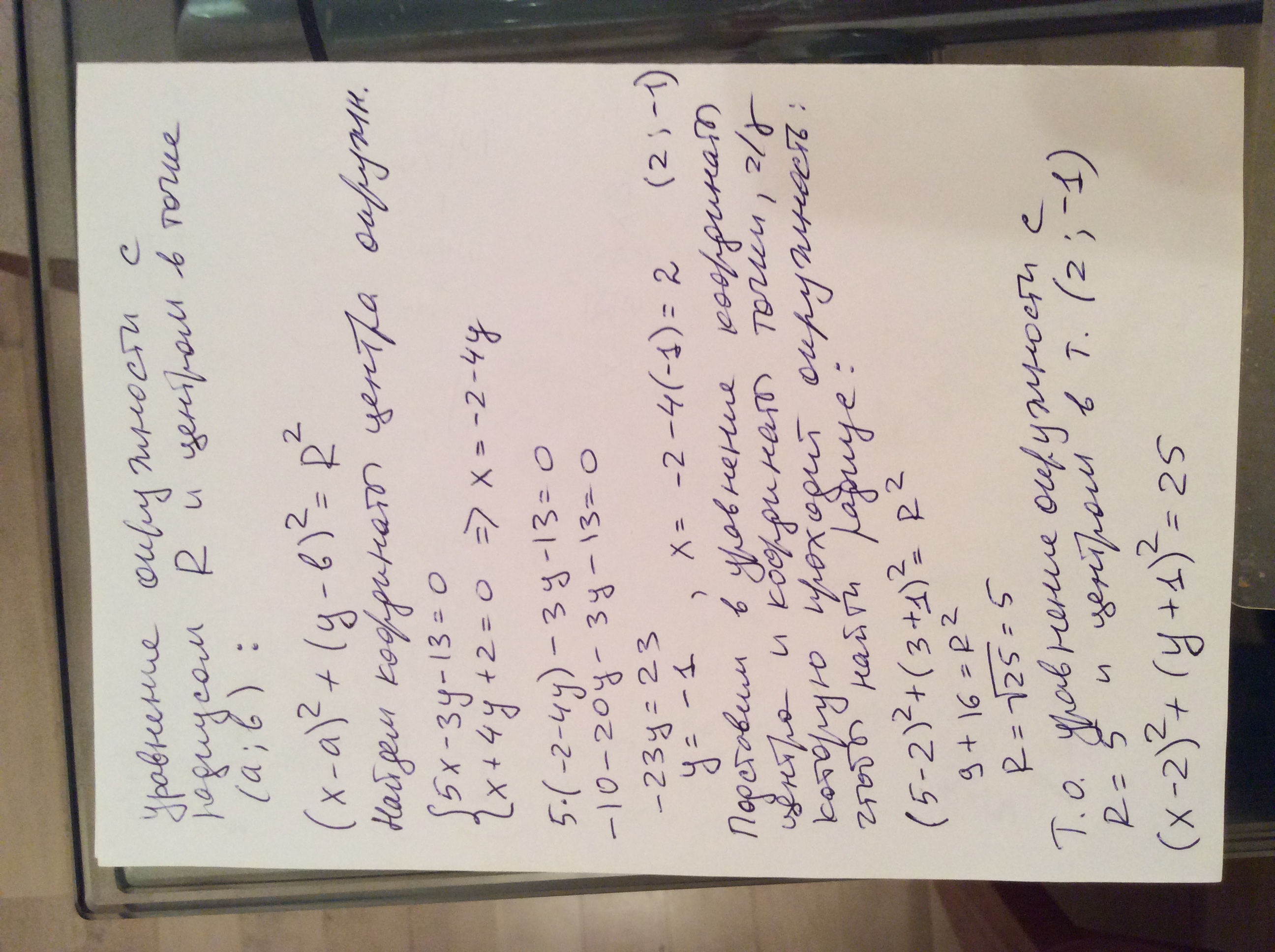 составить уравнение окружности проходящей через точку (5:3) с центром в точке пересечения прямых 5x-3y-13=0 и x+4y+2=0