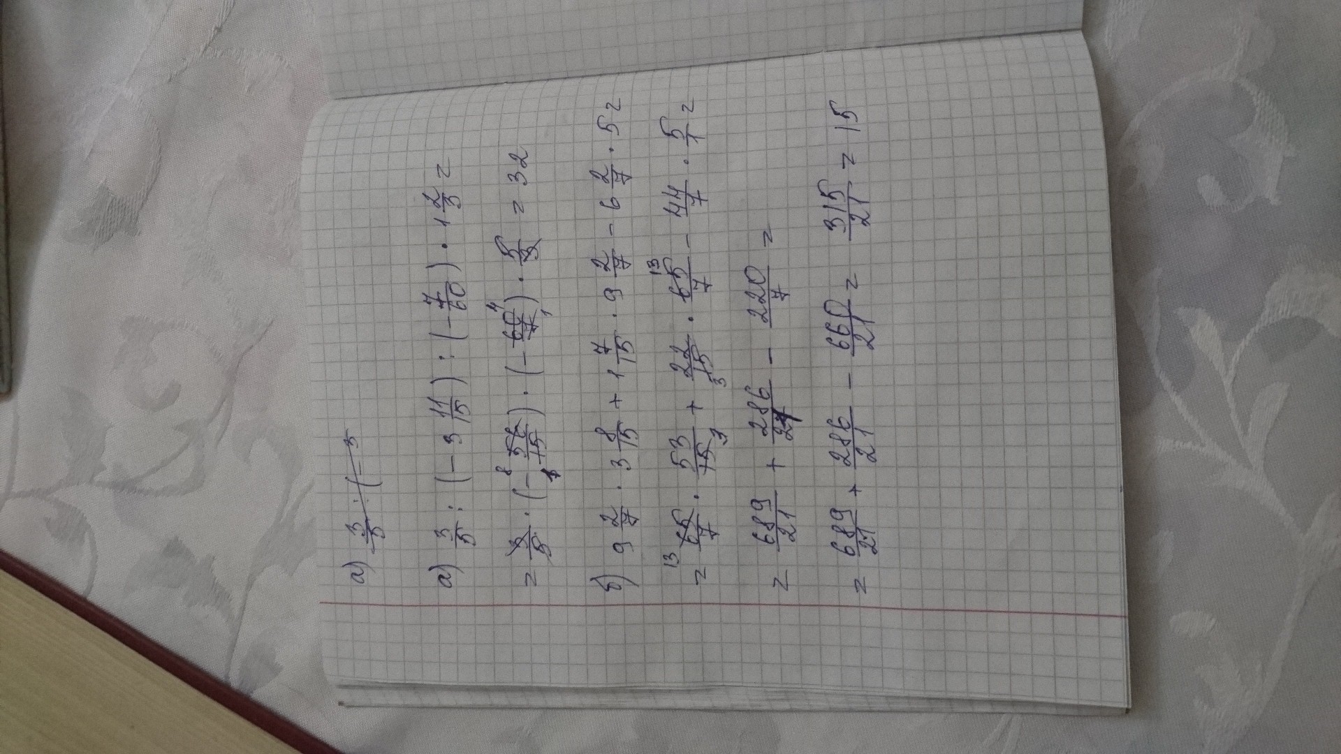 Помогите: а) 3/5 : (-3 11/15) : (- 7/60) * 1 2/3; б) 9 2/7 * 3 8/15 + 1 7/15 * 9 2/7 - 6 2/7 * 5 Заранее спасибо