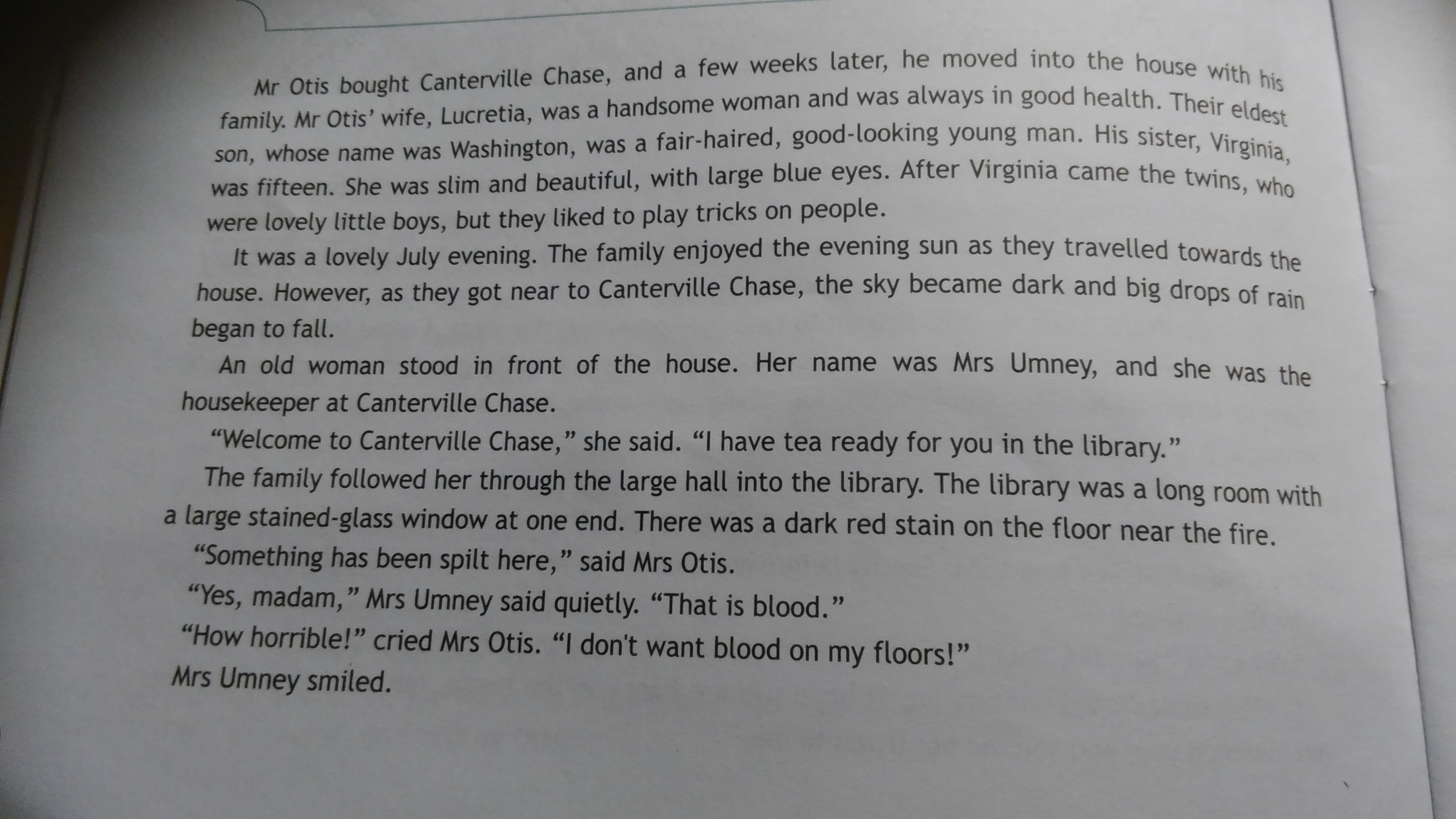 мистер Отис приобрел Кентервильский замомок, и через несколько недель переехал туда вместе со своей семьей.