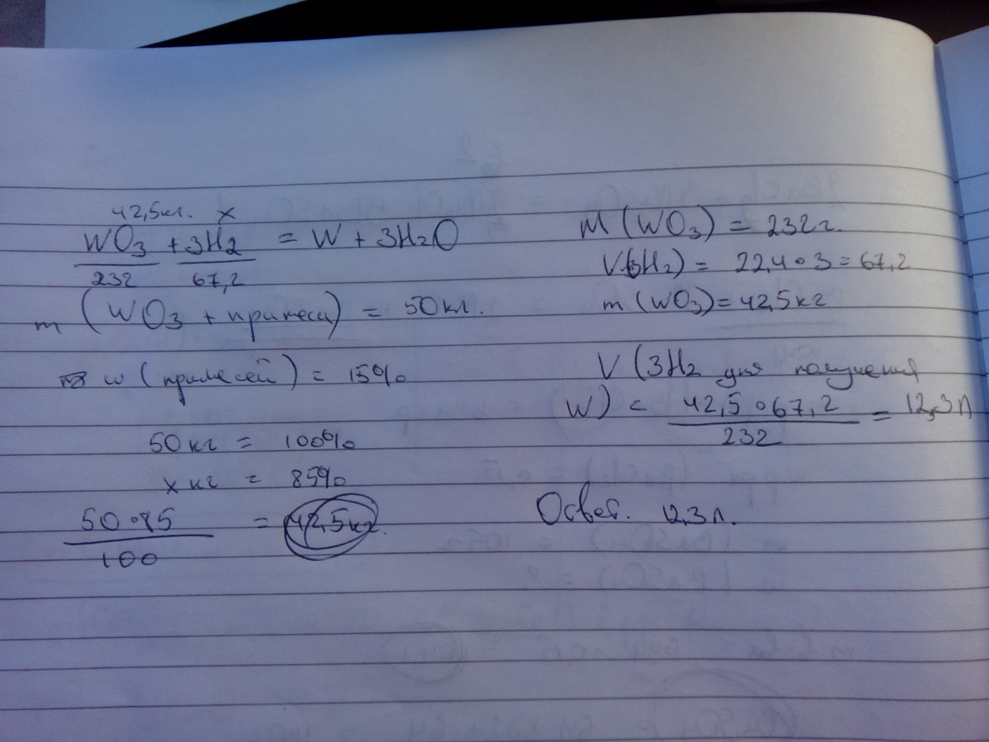 какой объем водорода потребуется для получения вольфрама из 50 кг.его оксида WO3,в котором массовая доля примесей составляет 15%