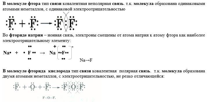 2) Даны следующие вещества: фтор, фторид натрия, фторид кислорода(||). Напишите формулы этих веществ и определите тип химической связи. Покажите направление смещени электронной плотности, если оона смещена; ответ мотивируйте. Составьте электронные формулы для данных веществ.