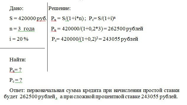1.Кредит составляет 420000 руб на срок 3 года по процентной ставке 20%. Необходимо рассситать первоначальную сумму кредита