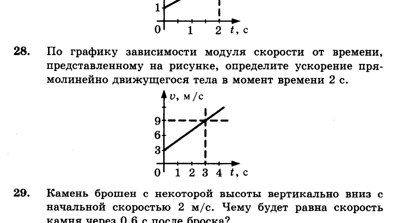 Мы видим что за три секунды скорость тела поменялась от 3 до 9 м/c. Разделим изменение скорости на время и получим ускорение
