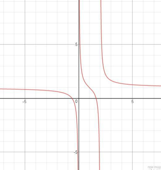 так как в знаменателе x^2-2x=x(x-2) соответственно у не будет равным 0 и 2, а график будет стремится к 0 и 2