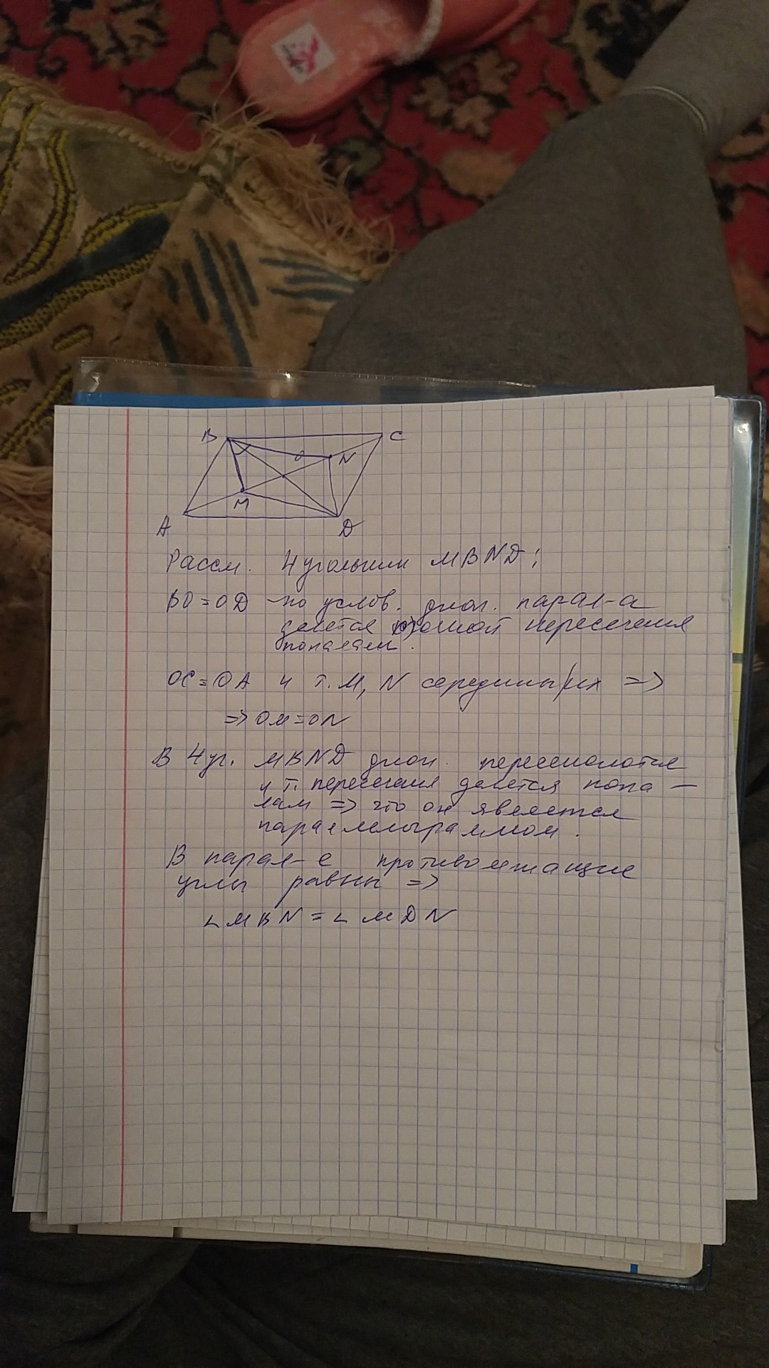 диагонали параллелограмма abcd пересекаются в точке o точка m и n-середины отрезков oa и oc .докажите что углы mbn и mdn равны.
