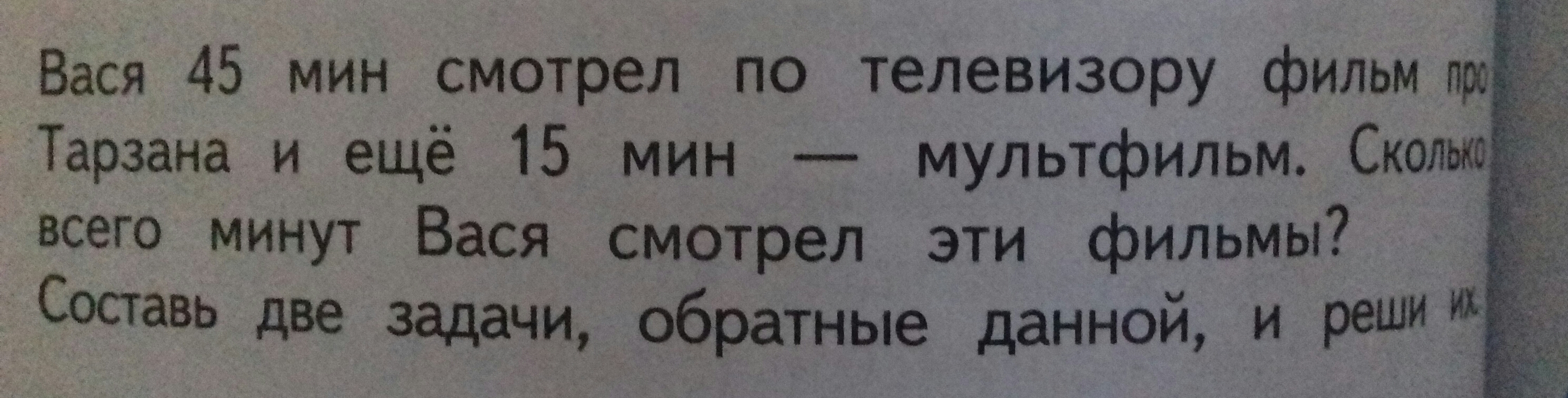 Вася смотрел 1 час фильм три Тарзана и мультфильм.Известно что мультфильм длился 15 мин. Cколько длился фильм?