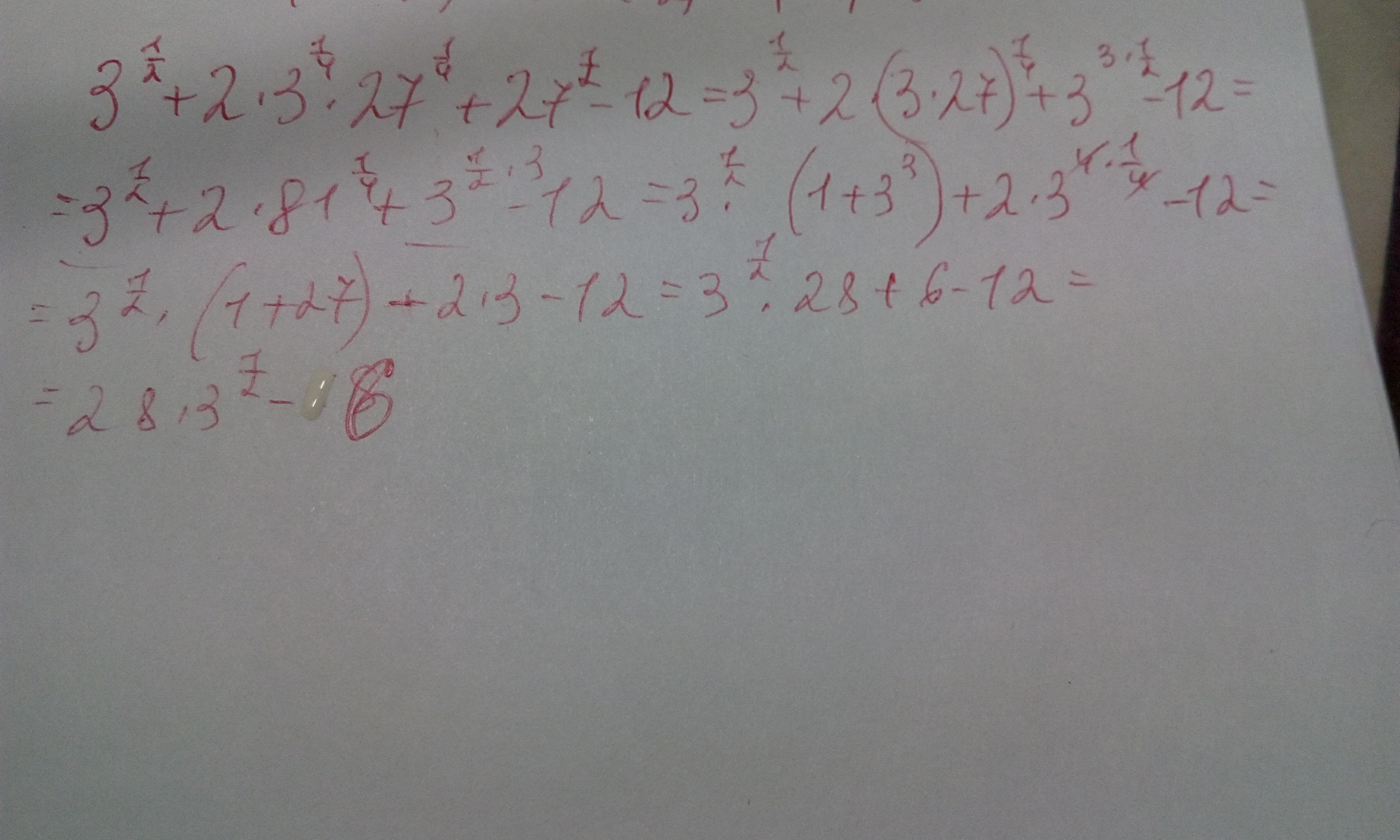 3^1/2 + 2 * 3^1/4 * 27^1/4 + 27^1/2 - 12 = 4 * 3^1/2 - 6