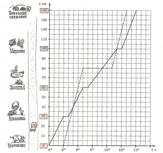 На рисунке показаны графики движения маршрутного автобуса и автомобиля "Жигули" по одной и той же дороге из Костиково в Новоалексеевское. Задачи а) Одновременно ли выехали автобус и "Жигули" из Костиково? Кто из них раньте прибыл в Новоалексеевское и на сколько? б) Изменялась ли в пути скорость автомобиля? Чему она была равна? в) Сколько остановок сделал в пути автомобиль? Какова их продолжительность? г) На каком расстоянии от Костиково находились "Жигули" и автобус в 8 ч 50 мин? В 9 ч 50 мин? В 10 ч 20 мин? Какие события происходили в это время? д) Какое расстояние было между автобусом и автомобилем в 8 ч 30 мин? В 9 ч 10 мин? е) В котором часу автобус и "Жигули" находились на расстоянии 20 км от Костиково?