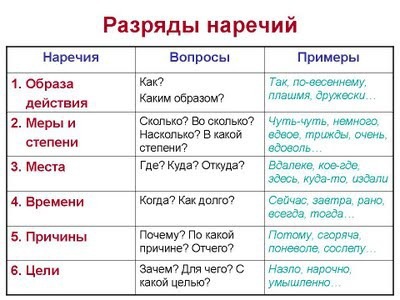 Смотри таблицу и подписывай наречия