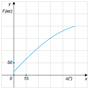 В аэропорту чемоданы пассажиров поднимают в зал выдачи багажа по транспортерной ленте. При проектировании транспортера необходимо учитывать допустимую силу натяжения ленты транспортера. На рисунке изображена зависимость натяжения ленты от угла наклона транспортера к горизонту при расчетной нагрузке. На оси абсцисс откладывается угол подъема в градусах, на оси ординат – сила натяжения транспортерной ленты (в килограммах силы).