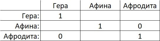 Составляем таблицу, в которой отметим, кто о ком что говорил (1 — это прекраснейшая, 0 — не прекраснейшая).