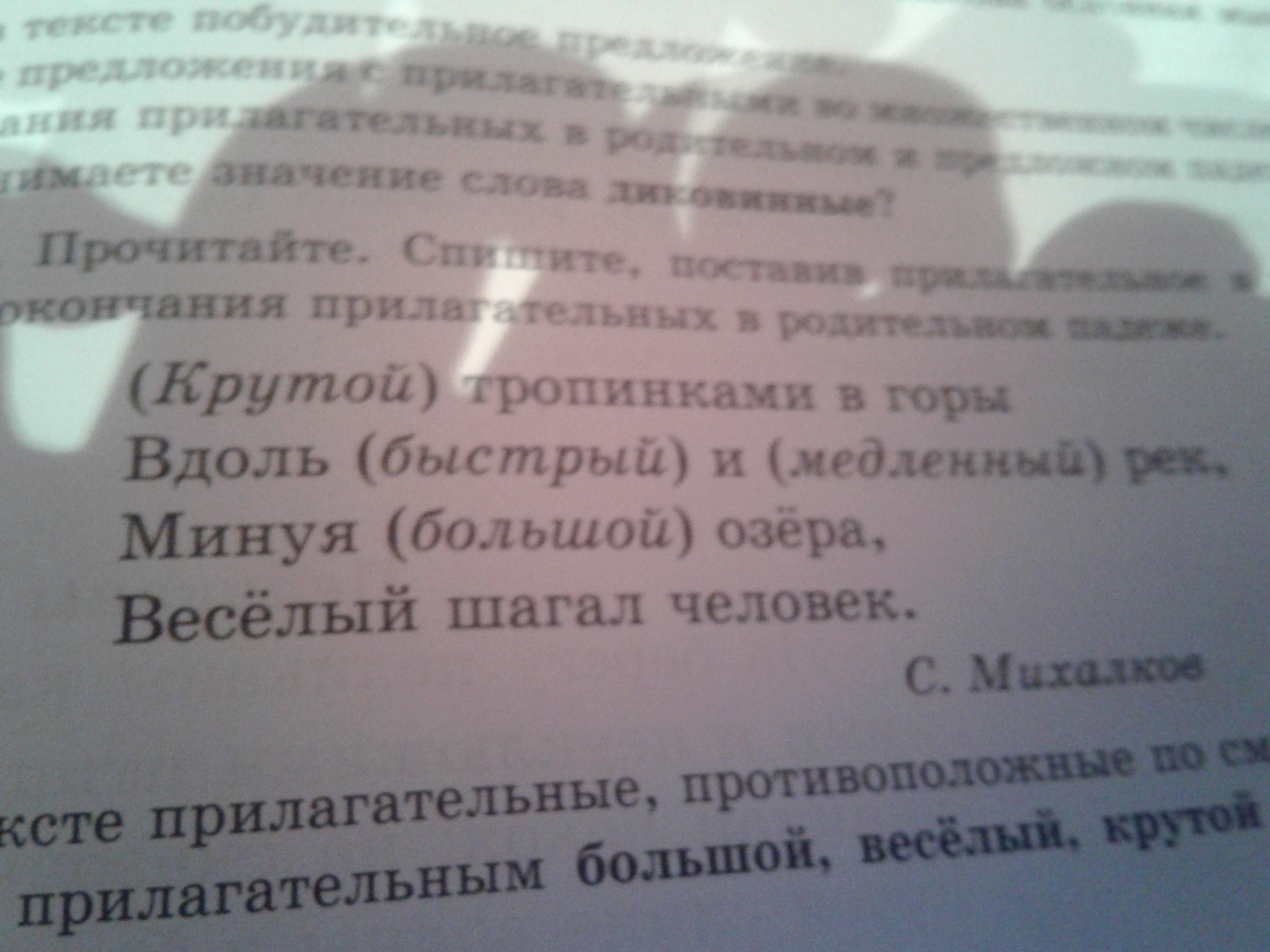 Прочитайте Спишите поставив прилагательные в нужную форму Выделите окончания прилагательных в дательном родительном падеже крутой тропинками в горы вдоль быстрых и медленных рек минуя большое озера веселые шагов человека