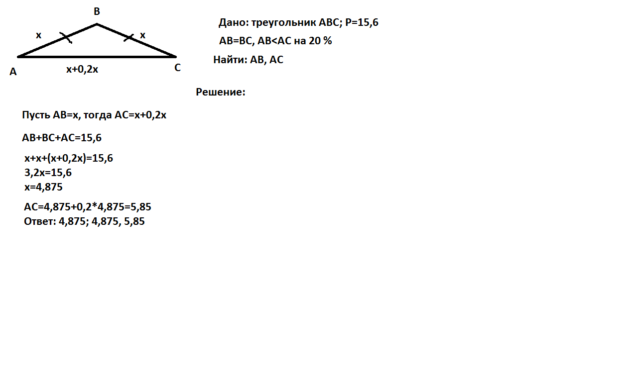 В р/б треугольнике боковая сторона на 20% меньше основания. Найдите стороны треугольника если периметр равен 15,6см