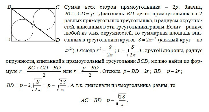 Периметр прямоугольника равен 2p. В треугольнике на которые делит его диагональ, вписаны окружности с суммарной площадью S. Найти длины диагоналей прямоугольника. Срочно!!!